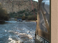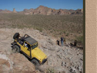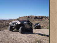 It was one of those dirty jobs that you almost realize right away no matter how gingerly you go at the task, you're going to end up covered head to toe, so you might as well just dive right in. The mud was so softly churned, we had no problem digging with our hands, save from the now almost freezing temperatures. It took a few attempts, but finally after digging down past the water table and to the bottom of J's tires, Bob was able to winch him out using Dana's Jeep as an anchor. All of this strain on J's Jeep created a new problem. Water had snuck into his Tranny via the top of his dipstick, and spinning in the mud in 4Low for that long took its toll on his drivetrain. What was left of his tranny fluid was boiling out the top of the dipstick and what remained inside wasn't enough to let his gears do their shifting. So, once again, we went about pulling a trannyless Jeep out of the Florence area. Bob, got us on the right trail on the opposite side of the river and we took Cochran Road (a wide graded trail) until it hit the F-K HWY and we found the pavement we had all looked forward to. A short drive to a Taco Bell west of Florence got us some grub and met us up with a tow truck. When the truck got there, who should it happen to be, but the same driver that took Dana's trannyless Jeep back to Phoenix when hers went out at Ajax. |  |