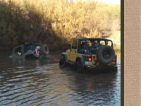 We stopped to grab a bite to eat on the bank and then let the Jeeps splash around in the shallow parts of the river. J found what looked to be a deeper spot in the river bend, and hesitantly let his Jeep feel out for the depthy bottom. By the time his windshield had started becoming goggles, J's panic bug bit, and he called for the rope. Without wasting much time (since pedal standing did not stop his submersion rate), we tied him on and tugged him back to a level plane. When he opened his door, out came a flood of collected water, but, his engine still ranneth. I will clue you in that maybe a little caulk around the air box would have bettered the final outcome, but the handful of water that managed to get in just sat in the bottom of the box until we sponged it out with a shirt. No worries- yet.