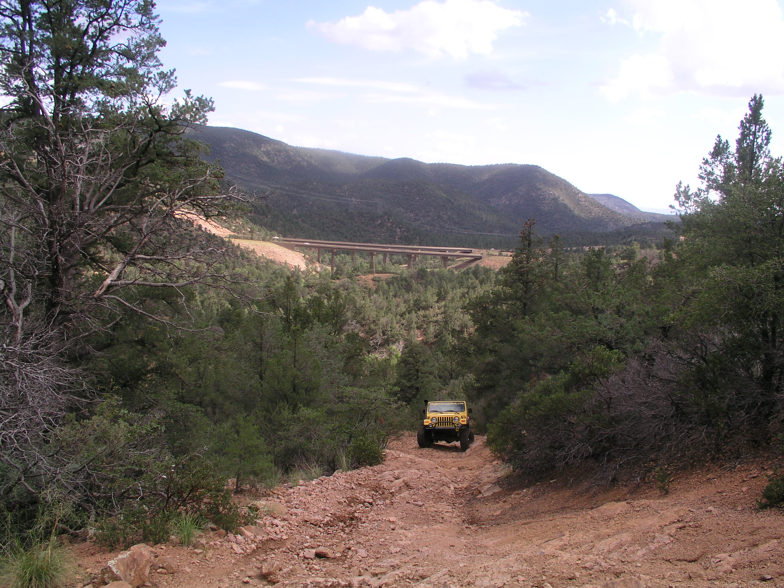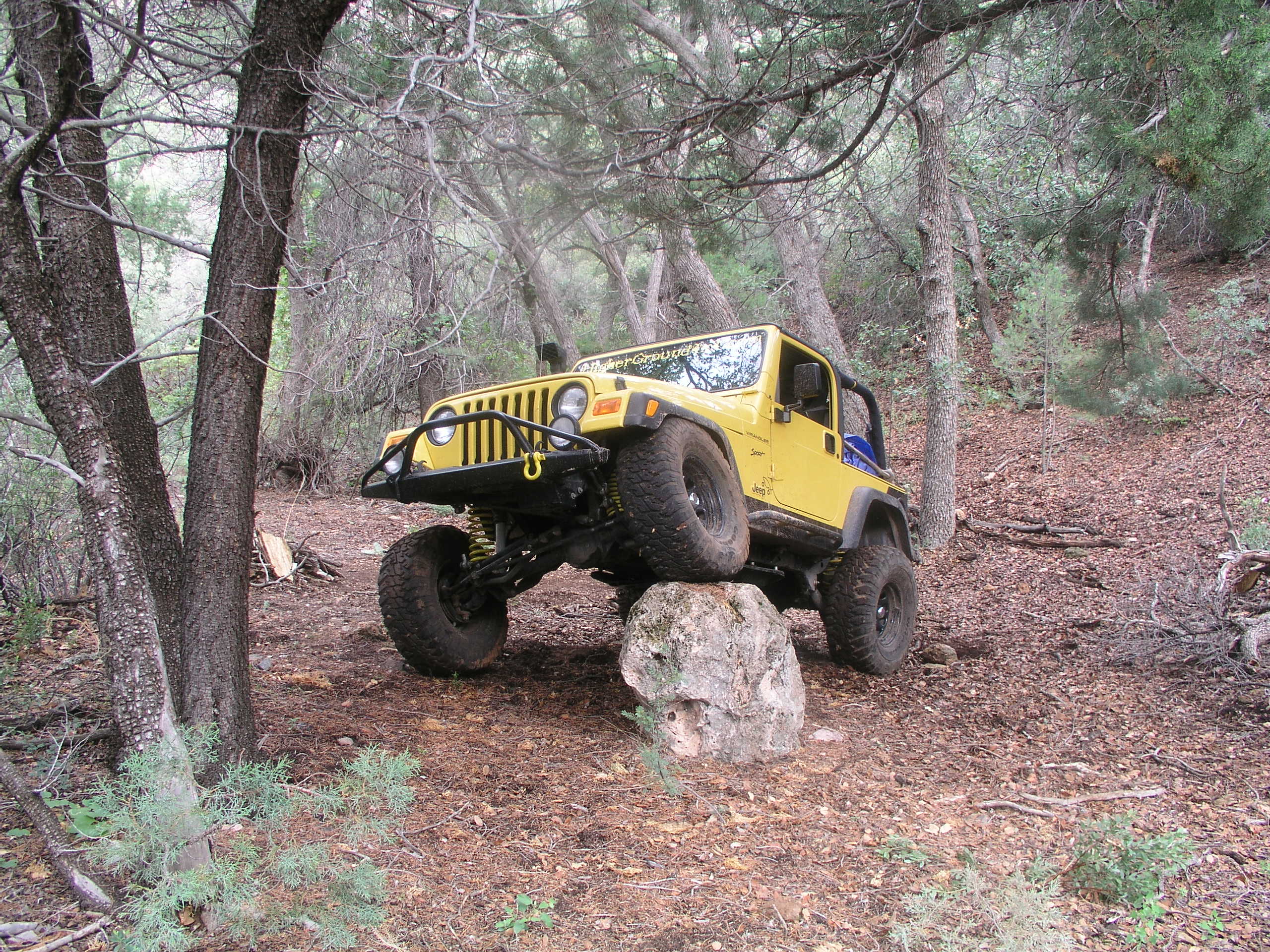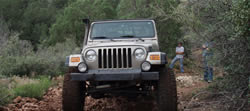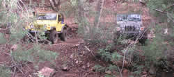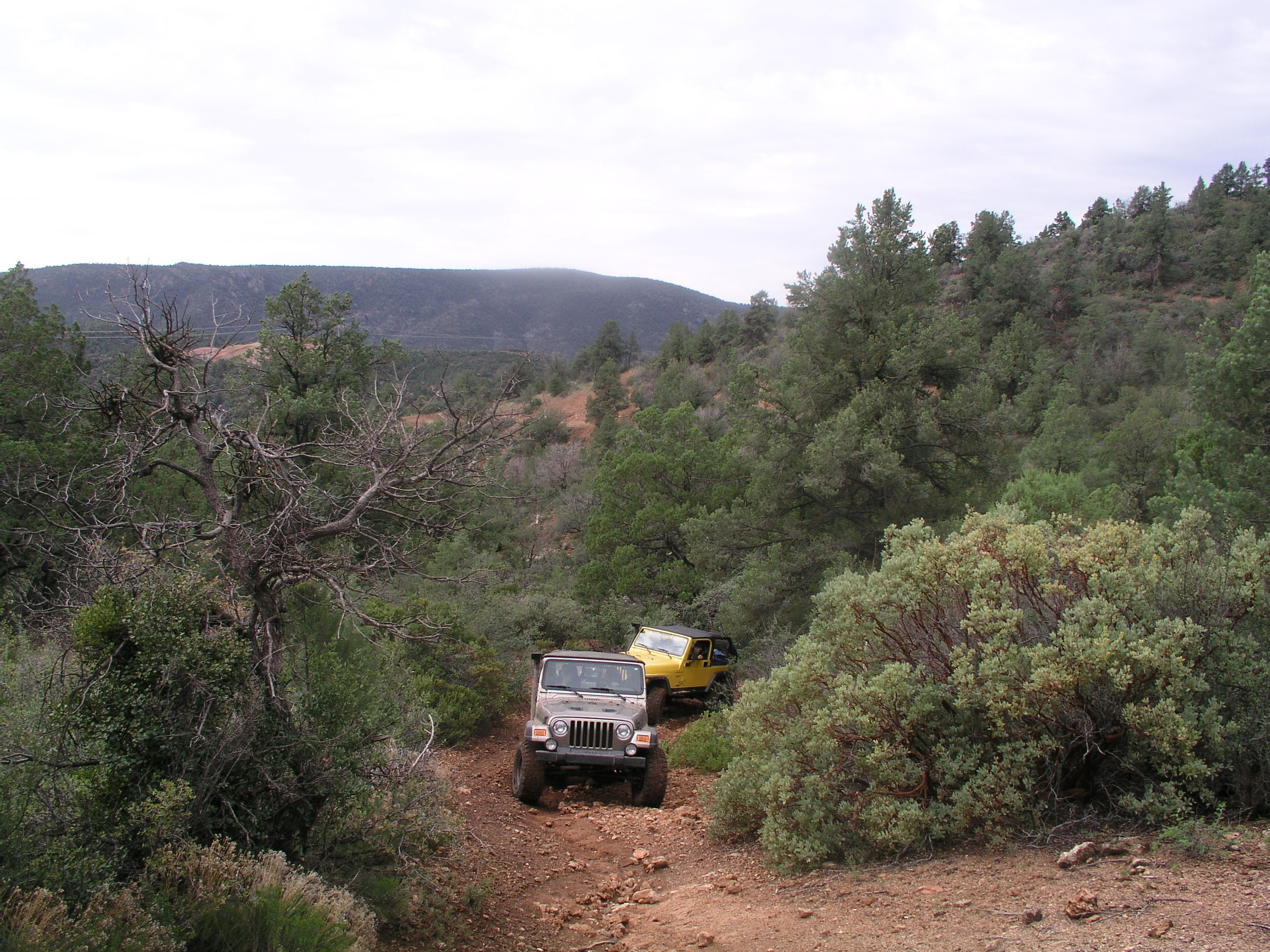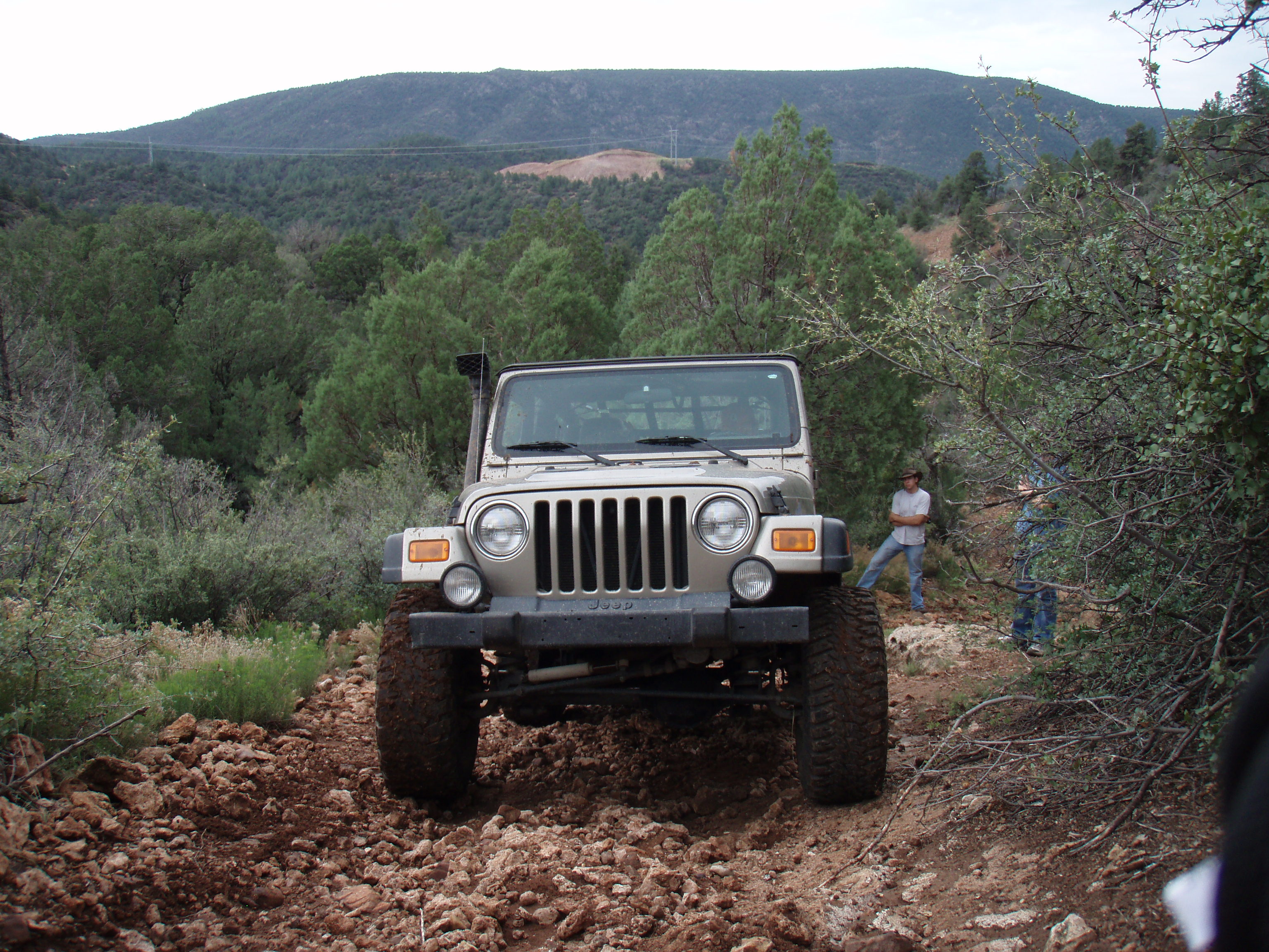 So anyway, the next morn we mounted up, tarped over all the gear in Dana's Jeep so if (read: when) we found mud it would all be covered. Then we went about completing the trail. The only problem would be that with the rain, the steep ascension up again had become loose with some large rocks providing off-camber situations. J went for it and made it up 3/4 until he forced himself to stop. You know it's bad when a Jeeper decides that instead of trying to continue up where the edge of the road is not your friend, the cliff below beckons your demise and the dirt itself is mocking your defeat, he will instead have to drive down that very same trail backwards. -Another time for me to step in and play coach to a team that cannot loose.