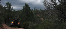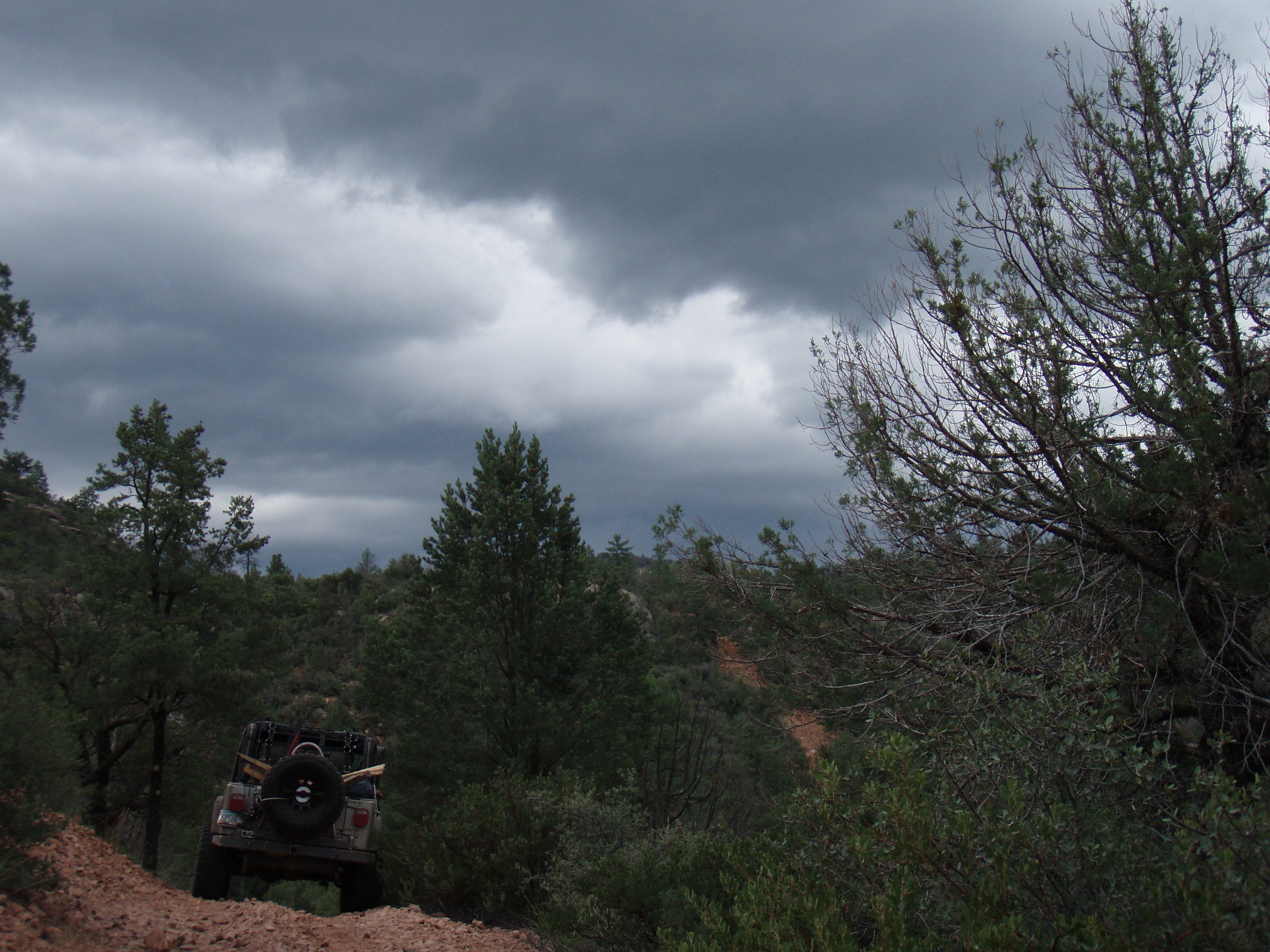 Our next objective was to take Preacher Canyon (not listed on the maps as a trail) backwards from way of the highway, The entrance almost eluded us, but we found ourselves under the bridge and headed north again along water. Our hope in Preacher was that we could take it all the way out to the control road some three miles north of where we began. The road we found along it was definitely not maintained and proved a little tricky as we drove higher and higher along the canyon. By the time we got about to the halfway mark and back down into the creek, the dark clouds had given us a heads up into what was going to happen soon. So we settled there, rigging our shelter Jeep style like at Sunflower (only w/o the snow), both Jeeps parked parallel and a good sized tarp tightened and tied in between. We then got out the chairs and fixins and cooked our meals as we watched the rain.
