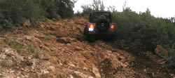 As I stood behind to guide the bumps and slides down to safety, Jared, not because of fear, but to feel the Jeep and only react to my instructions, simply closed his eyes. Now his only input was me and the gravity tugging at his wheels. It pretty much became like the Luge at Martinez: a controlled slide only once again backwards. His ears and hands did their job though and we got his Jeep off the 60 yard incline intact. We then had to face the facts that last night's rain was going to cause us to detour and backtrack. |  |