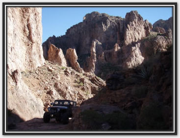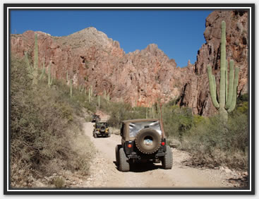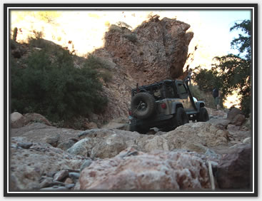 Well, it took a passel of hassle, but most of us were able to get our rears in gear and make it back to Martinez. We were delighted to have our new, yet old in the saddle friend, Bobert make the run with us. It had been a few years since he had been there, and I had been on a couple of trips before, but Jared and Dana hadn't driven the loop yet (for the record, J did play gear hauler in his stock Frontier to the cabins a while back). We took the weekend off and planned to hit Martinez Saturday, camp overnight, and then run to Coke Ovens, taking the Gilla out. The desert trail was pretty crowded out until we got to the Cabins. There was a circus of random vehicles rethinking the rain washed trail just south of the Cottonwood Canyon lead in. It was obvious they were having a tough time when they all gaped at us passing by at our leisurely clip. Everything was pretty uneventful all the way to the WH cave where we lightened our load by dumping off our camping gear. As always the greener and wetter spots in the start of the canyon, provided some very nice photo ops. I was grateful that J's Jen was there to help out with pics too as Martinez always photographs well with its scenic back drops and jagged lines. After the cabins, they put it in low and went out in search of trail obstacles. Martinez, while not filled with over the top rated attractions, has plenty of rocks to be negotiated all along the way. Many people just call it a day after reaching the old mine structures, or even just at the cabins. As long as you have the clearance and flex for it, it's pretty much just a matter of staying on top of things. The rain hadn't put as much of a hurting on the trail as Ajax, but it was still evident. The various rock gardens sprung out at the Jeeps pretty strong, and were assuredly larger than we had remembered. Everyone still did pretty well on the trail, a few snags from underneath here and there. More outside help was necessary as I shirked my spotting duties and scampered off to play mountain goat to get different shots of their progress from ahead and above. The Jeep drivers took turns leading, chose their own lines, put out their helping eye for one another, and at least from an elevated position, made it all look gracefully doable (especially Bob hunkering on his 37's). While everyone had their own picture worthy styles, Bob also took a couple noteworthy chances to test out his maximum tippage point- without incident to the camera's dismay. The mine building came quickly enough, but it was the switchbacks that required the double pedaling (pun intended). The season's monsoon storms had rutted out some nice footprints on the 750ft twisted climb to the top, and one off-cambered moment did manage to launch one of Bob's rear springs off. It took some doing to get it back in, but a hi-lift finally got us a moving again. Later on during the ascent, a rope and some weight shifting was needed on Dana's Jeep (wasn't her driving), to keep her Jeep moving forward and not... well, over the side. When we got to the Silverbell/ Columbia mine conglomerate, a few of us explored the levels and managed to find our way in one hole and out the other. We didn't spend too long there this time, because the sun was racing us to camp. At the summit we were just in time to shoot a great multi-wranglered sun down shot that'll definitely go in our keepers book. We took the Luge bypass (which seemingly is becoming the new Luge), at almost full dark so the camera couldn't capture the Jeeps sliding down. I did notice by headlights, a couple Jeeps almost side walling on the way down though. Once we were all grounded again, we found our way back to our camp stuff, and half of us gathered wood while the others set up camp. It was supposed to be low 30's in nearby Florence, and even though we were in a damp canyon, experience had taught us we'd be fine with a fire in the cave hollow. In fact, we stayed cozy in regular shirts from fire until dawn. When we woke in the morning, we packed it up and headed out toward the Cokes. | |