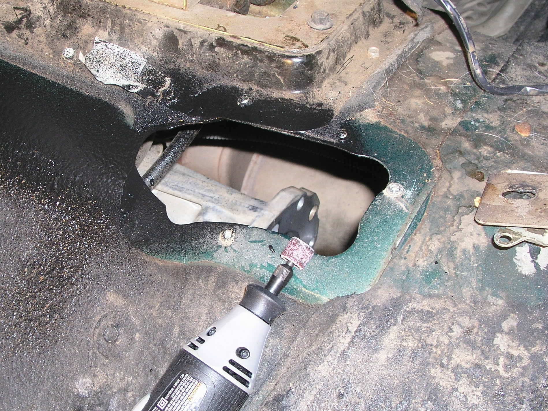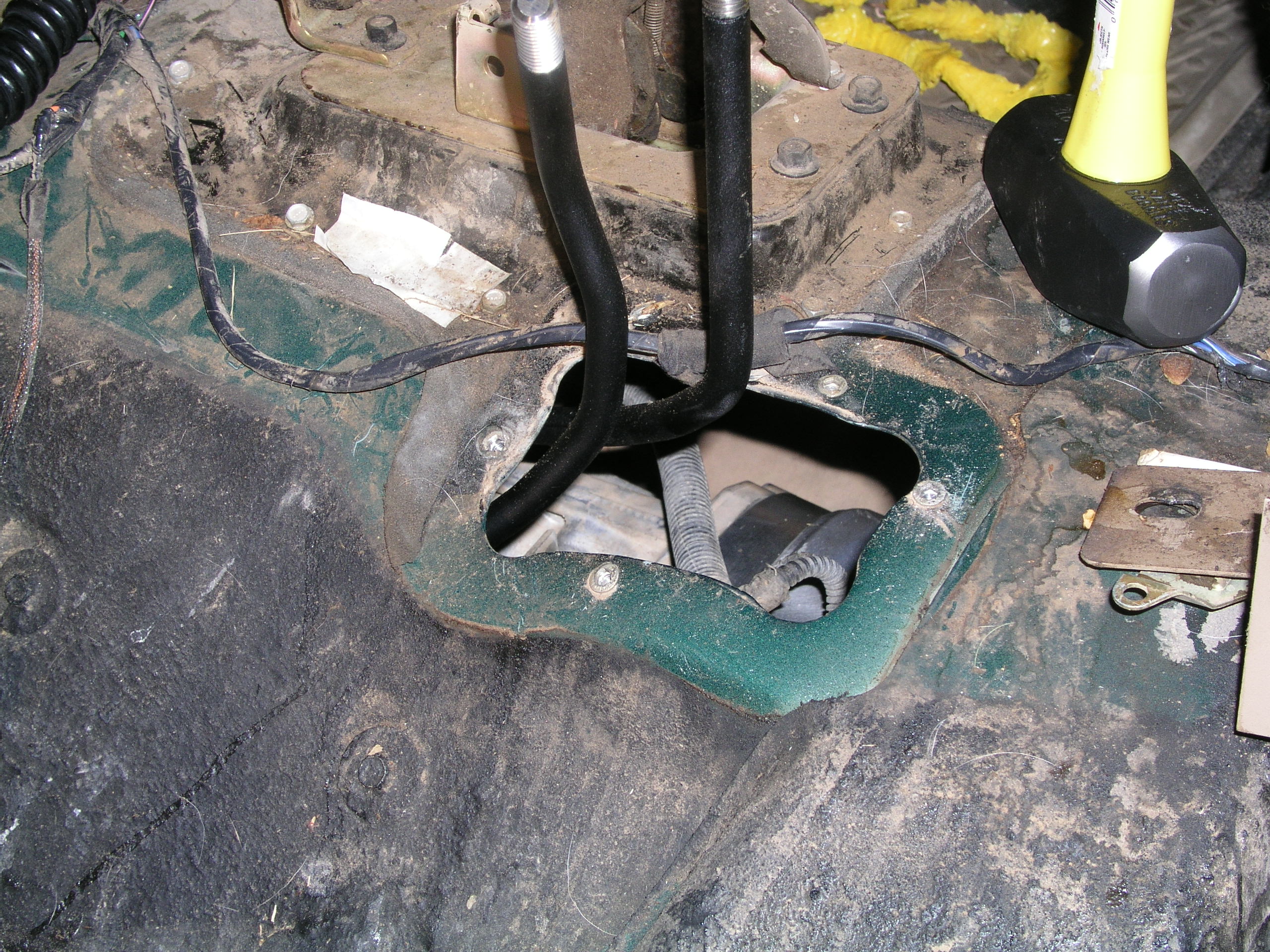 the tranny, carefully guiding the shifters through the floorboard.