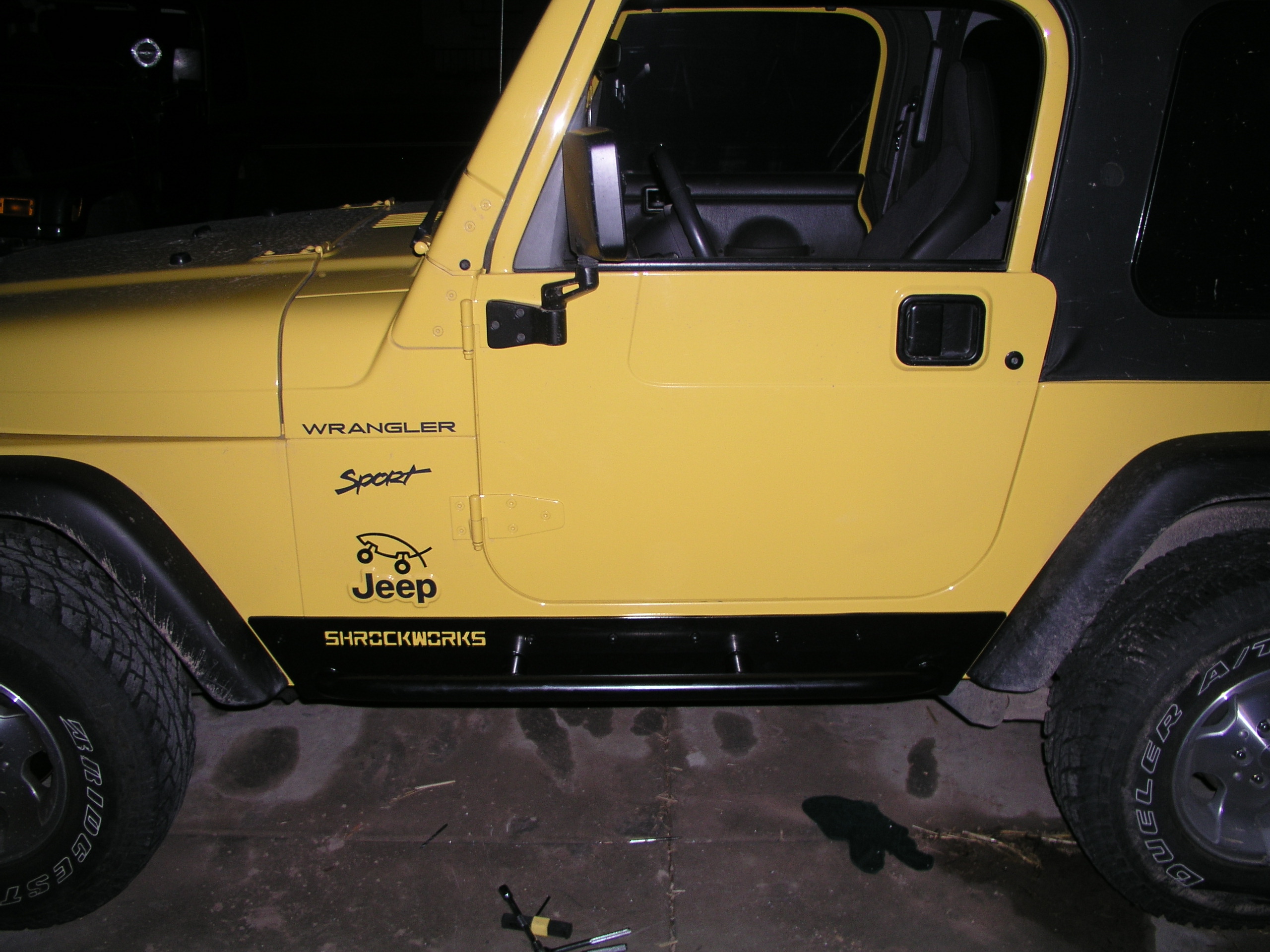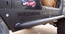 It was time for the third Jeep (Dana's new TJ) to get the Rocker Panel treatment.  Chris had gone with the Poison Spyders, and Jared with the Blue Torches.  We usually try to go with something different than one of our other Jeepers has.  Guess we'd rather spread the money and the brand names around.  Plus it's fun to customize to ones own likings and then to compare them all in the end.  We liked the slider/step bar that came on the PS guards, but then BTF included support brackets where their guards mounted to the body.  Also, the more coverage the better, so the more metal included to protect our Jeeps and wallets is an obvious plus.  Both the PS and the BTF guards had plenty of bottom coverage as well as side protection (with the BTF offering a little more underneath).  Based on the performance of these guards we wanted something similar in design and that turned out to be Shrockworks' Sliders.  Their guards not only offered the side bars and complete protection underneath , but utilized 3 backing plates to reinforce the mounting through the floor.  So seeing the best of both worlds in their design we jumped at them and had them sent out immediately.  Also in keeping with the other Jeeps' guards, we requested the Shrockworks logo be laser cut into the side as well.