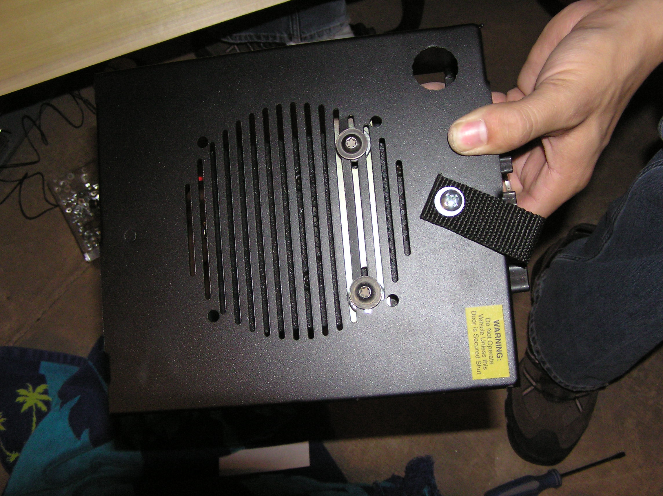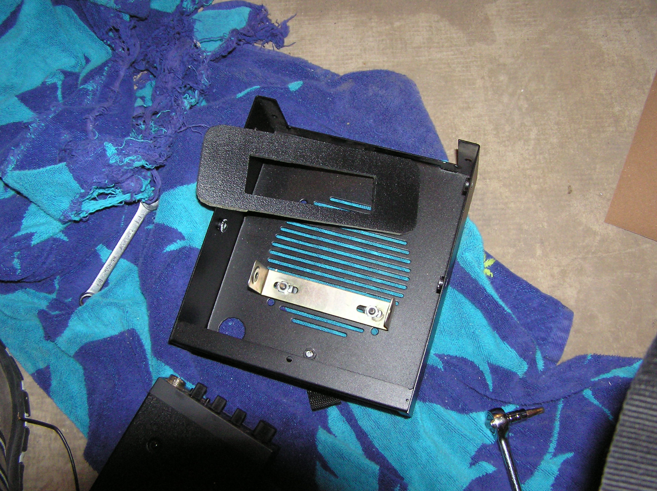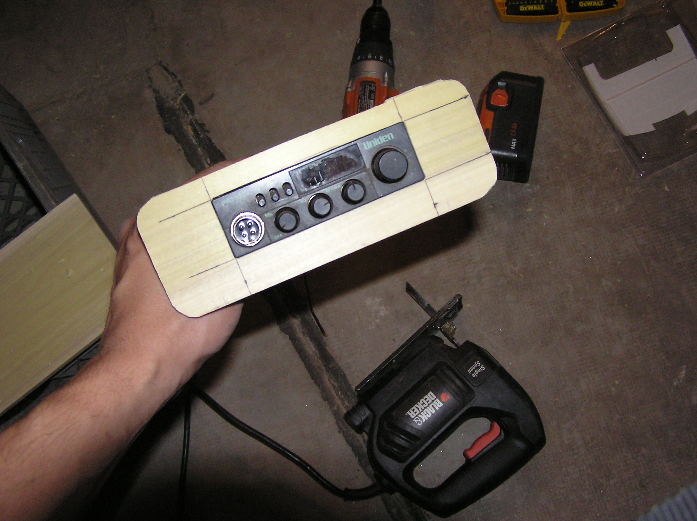 Before we began the actual install of the console, we set it up and figured out how we were going to mount the CB. The Uniden Pro250XL is a pretty compact unit so it almost swam in the large Tuffy compartment. We used the original CB mount with the addition of some longer bolts and spacers (large nuts) to center it in the compartment to where we wanted it. We then placed the mounting bolts through the grill (we painted them black of course) to secure it down. I convinced J to let me make a "custom" face for his CB, so it would stay centered, look clean, and keep clean as well. We just used some thin 1/4" scrap board, measured a million times and then curved the edges so it would fit flat against the inside of the compartment. We actually cut it so perfect that the face alone instead of the mount would keep the CB from bouncing around. We then used the next best thing to duct tape, spray bed liner to paint the custom face. The face used with the mount sat so nicely in the console, there was no need to glue the face in. |