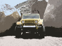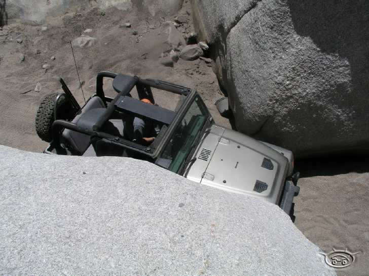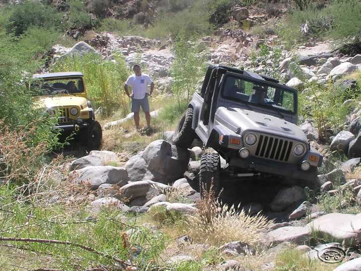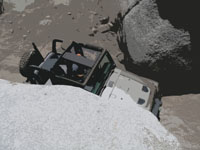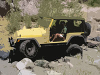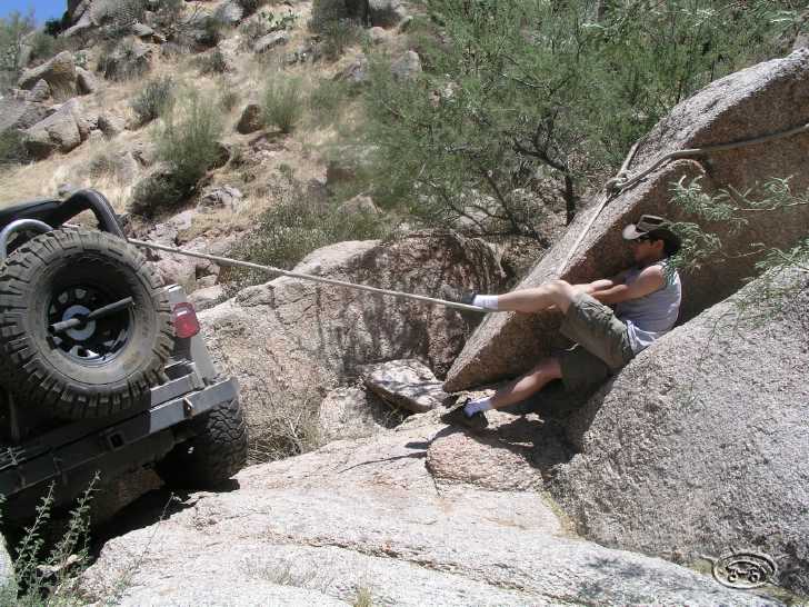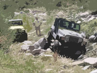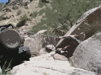 Anyway, again this trip, the drivers pretty much left no obstacle untouched. Once reaching Squeeze Rock, the end of our main trail ride, everyone had pretty much had their fill and there was no reason to run her again. Although, Jared, maybe because he felt he needed one more challenge, or maybe because the camera man felt he needed to use up all of his film, tried a tough little rock climb for higher ground. He pushed it and managed to maneuver up it for a nice king of the hill view. It was the straight out way off the mound that provided the real challenge though. It consisted of a multiple stair step, not too bad, as long as the steps matched up. But because they didn't, gravity fought his opposing wheels and almost won, forcing us to strategize a way to keep J and his Jeep from rolling door to top onto some jaggedly placed rocks below (one that was poised to come through his doorless side. To make matters worse, when J got out, after we had roped his Jeep off to the nearest rock, his seat belt locked up like a Banchee and we ended up having to disassemble it to get him strapped back in. To make a long story short, we got him to ease it down, while tied off and all three of us guys, easing his slack down. It was actually fun teamworking him off, but you could totally tell if we had slacked off the rope, we would have tested Darren's knotting skills for sure. |