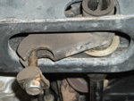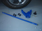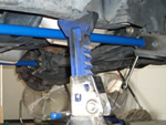 This is accomplished by removing the rear anchor mount (the crazy frame crossmember rotating spline mount). You must first remove the double nut on the top of the seated bolt. Then you loosen, but don't remove, the front mount (3 nuts) on the lower control arm. Now with a little pull and push power, you can give the T bar enough slack to drop out. Now you can replace the stock bars with your new blue ones, inserting them first into the rear mounts and playing them forward to meet up with the C arm mount. You can tighten back down the front, but only put the rear anchor bolt in enough to keep the bar hanging there since you will be adjusting it at the very end of the install.