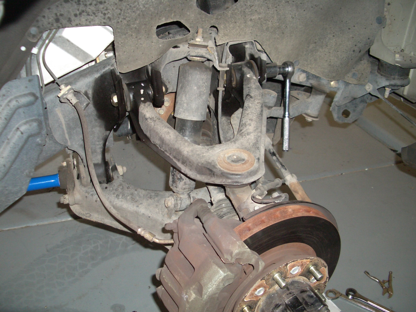 After loosening the font lugs, jacking the X up as high as possible supporting the frame, and removing the wheels, I took a look at my new IFS underworld. When the, "What the %@#* is that?," "Where's the...?," " What in the world does this do?" 's finally past and I got my bearings, I began my work.