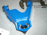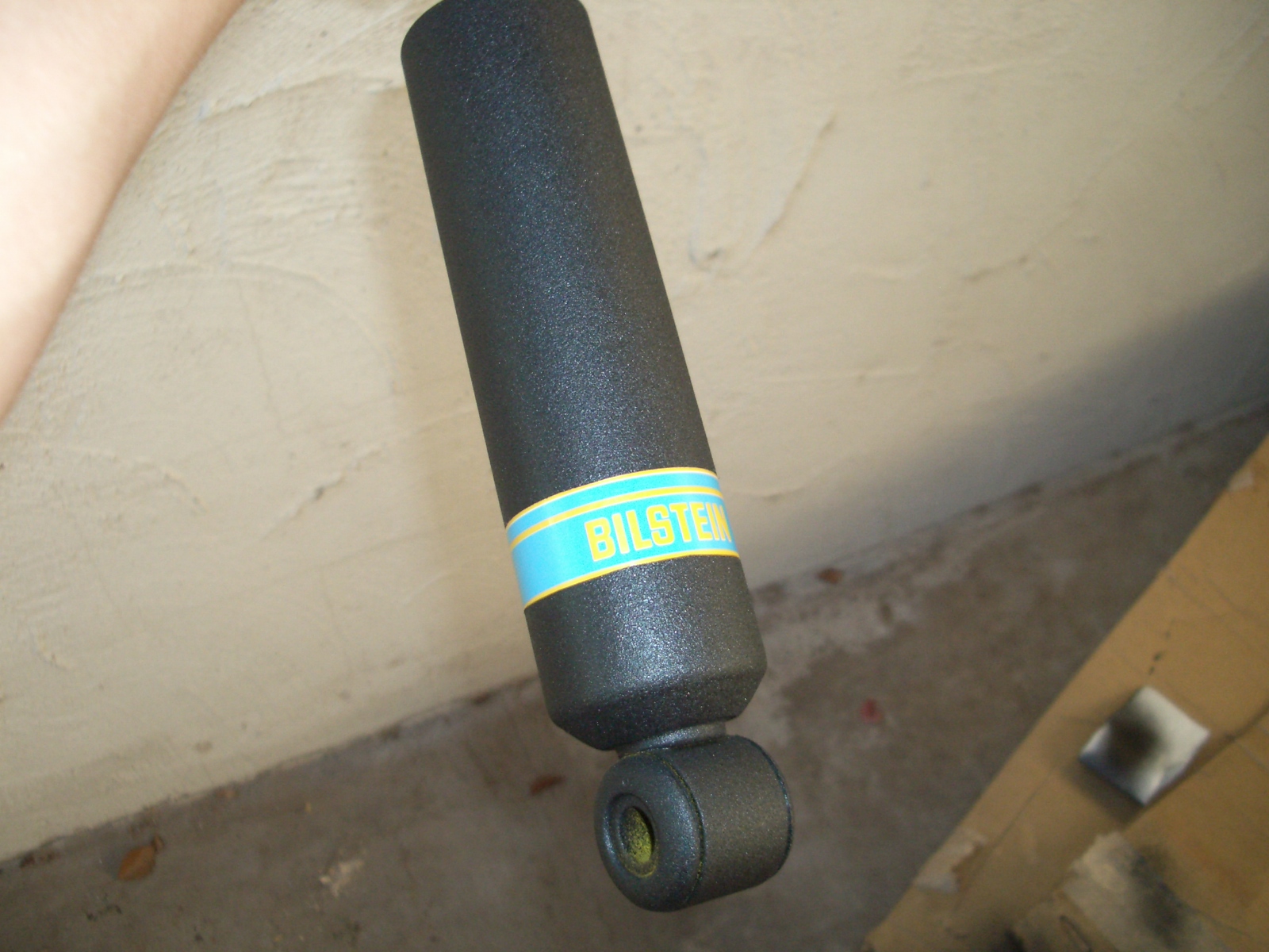 There's a lot of talk about Bilstein extended length shocks' performance, especially up against the ones included in the Calmini package . So I opted out of the Cal's ($100 off) and bought a set of Bil's from 4x4parts.com. Upon the recommendations on many other lifted X drivers out there on bulletin boards, I chose the 20% stiffer shocks all the way around. 20% for the back so the rear sway bar can be ditched and 20% up front to handle the beefy Shrockworks bumper I must have. The only prob I had with the Bil's is that it looks like a 3-year-old picked out the color scheme with the crayon yellow tubes and the pathetically flimsy plastic (non accordion-style) cornflower blue boots. So I cut off the boots and used the next best thing known to man besides duct tape, spray-on bed-liner to paint the corny colored shocks. I liked the way they came out and I made sure to tape over the label when I painted so all the chickies would still know I roll name brand style. |