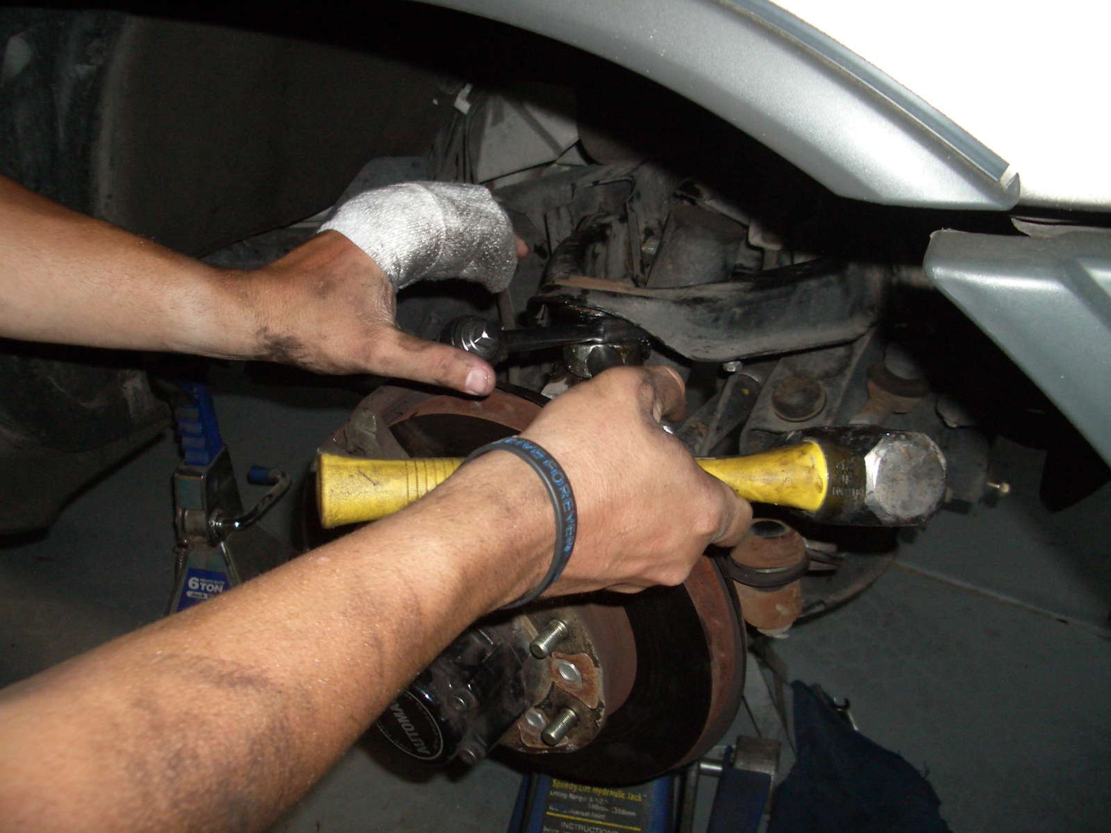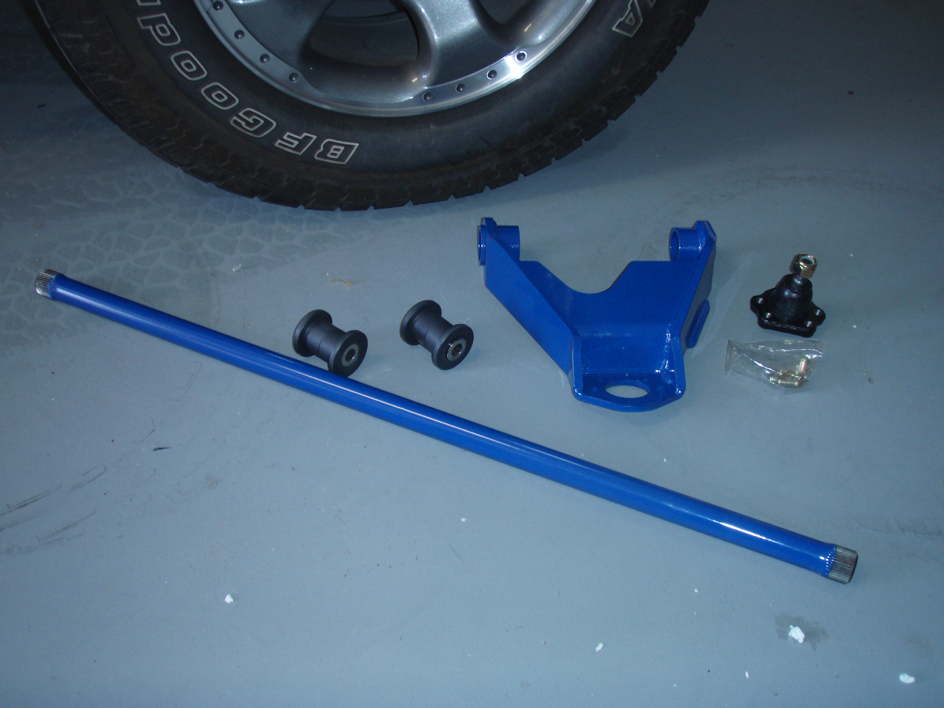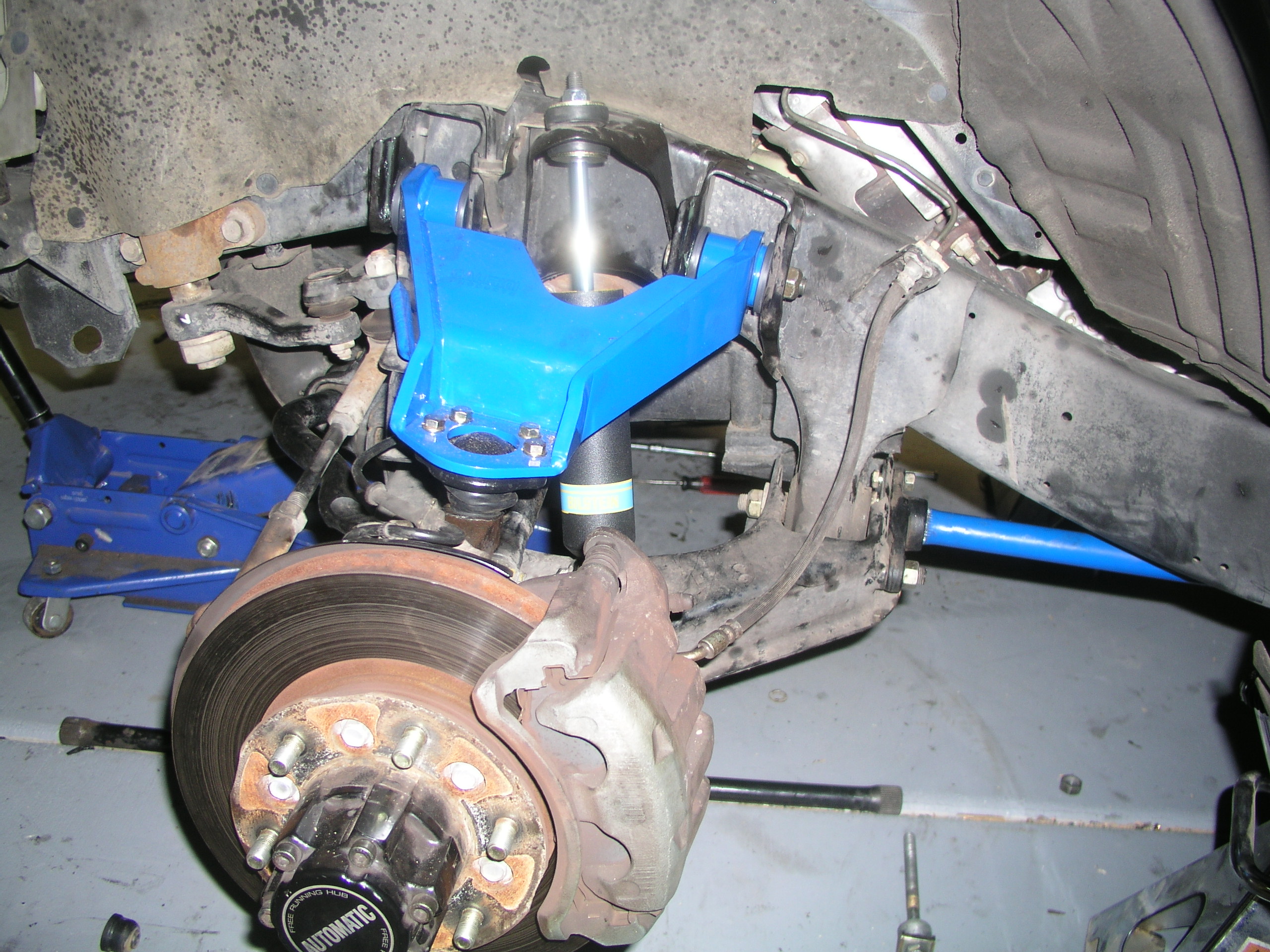 Anyway, just keep telling yourself things like, I won't be needing any of the old parts, I can bend the brake shield back, and, you think you're better than me you ________. There are many ways people claim helped them remove the joint, but we tried everything short of using combustibles (to Chris's dismay) and it just comes down to the simple fact of how bad you want it. Sure, try different angles with the sledge, different sized pickle forks and breaker bars, using the weight of the vehicle, but like some other things in nature, when the time is right, the joint will know and it will know what to do. 5 hours of labor later, we got the best of both sides. One helpful effort came after we had stripped the joint clean of rubber and rings and then we aided our fork with a set of vise grips clamped onto the clean metal. Okay, insert the time frame you need & then celebrate your win with pizza cuz now you can finally stop swinging your battered red arms and install your new blue ones. All that has to be done is to set the bushing halves (grease) in and to bolt on the new ball joint. Then you can install them trying to get pretty close to your cam bolt alignment marks.