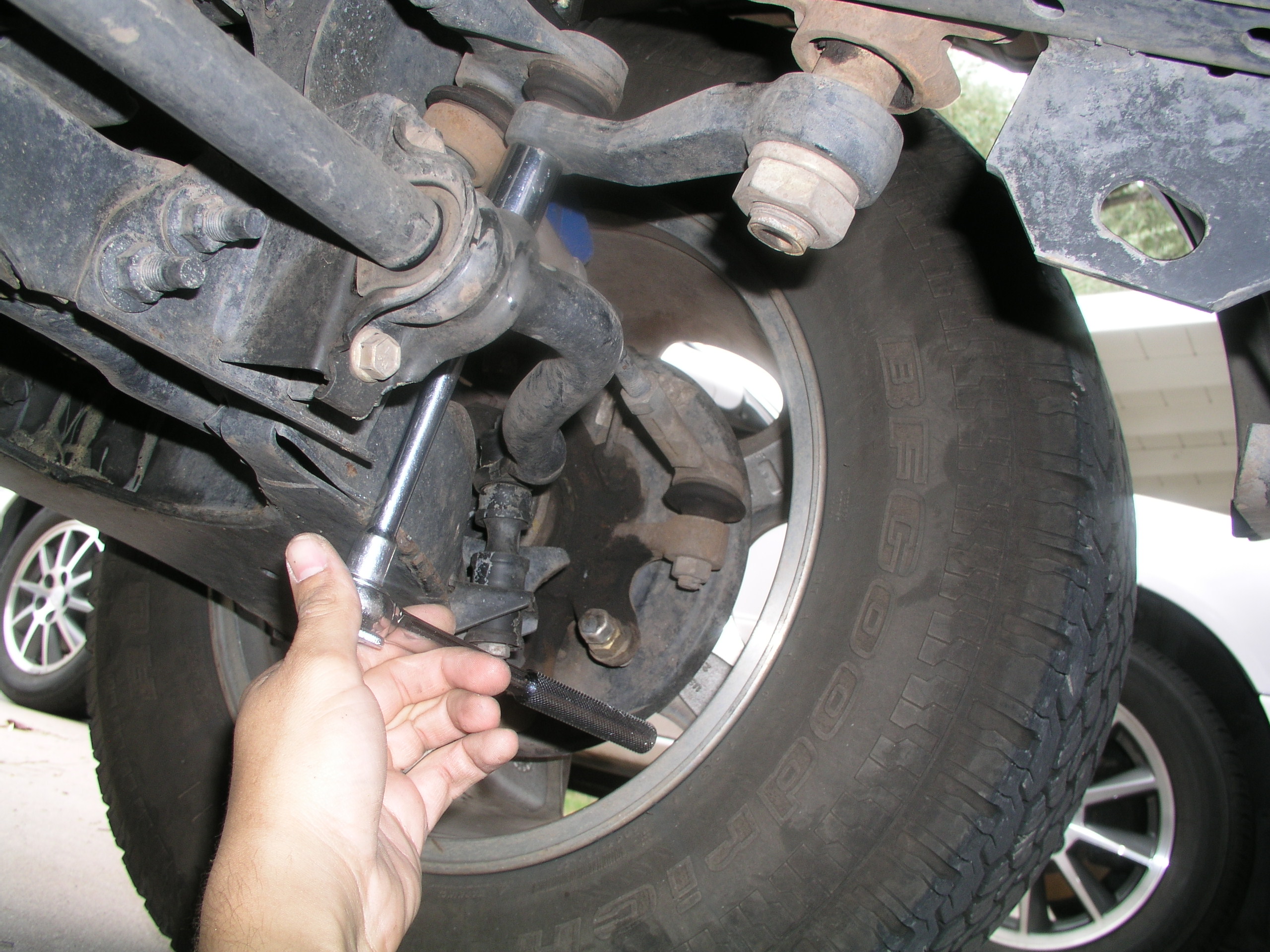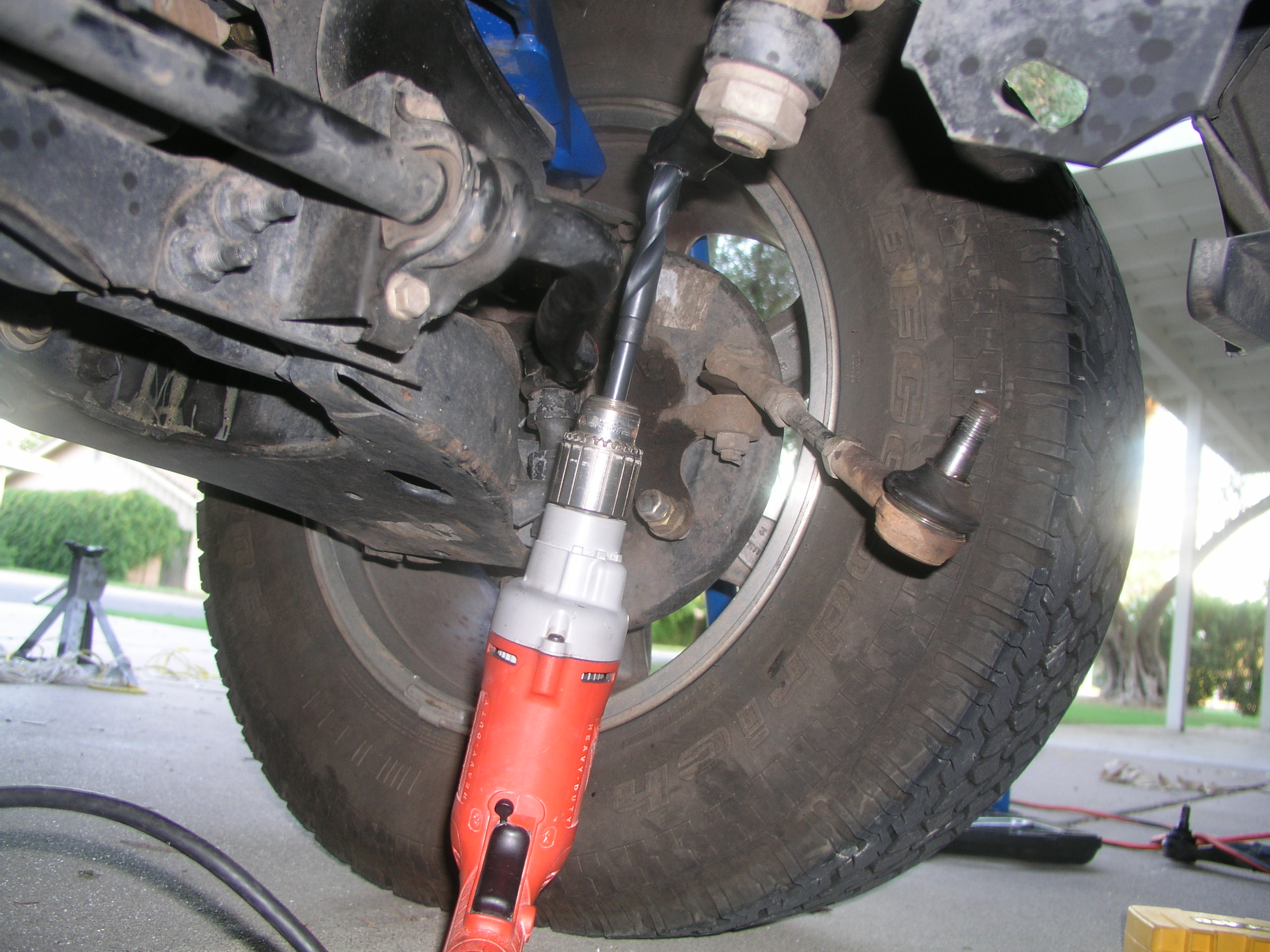 While the paint dried, I removed the stock skid to get access to the steering. The old centerlink was the next thing to remove and I already had my trusty pickle fork in hand. After removing the cotter pins and castle bolts off the Tie Rod Ends (TRE), I positioned my fork and focused my pent up anger from my work week and went to town with the hammer. Now it is quite important that you don't fork-up (for lack of a better term) the grease boot on the TRE or the threaded ends since you'll be reusing those. After spraying the tapers a few times with Liquid Wrench and finding the best position for direct hits and leverage against the seemingly welded on ends, I was finally successful in wacking them...(where's that thesaurus at?)...away from each other. Then you can try your hand at the centerlink tapers that attach to the Idler and Pitman arm. I ended up leaving the Idler Arm and the Centerlink together since I would have to replace the a IA with the provided new one and the old one can slide off it's pin with the removal of the lower bolt (plus that end decided to be the bear of the job, so I just shipped the whole assembly back still connected). The Pitman end came off pretty easy with the fork, so once I had those parts of the equation removed, I was able to pull the Centerlink completely out. I did remove the IA pin bracket from the frame to make this easier. Now's the time you have to break down and buy one of those large, expensive odd sized drill bits that you'll probably only use once. Unless you got the Pitman Arm upgrade (I didn't) or the upgraded Idler Arm (I did) you're going to have to enlarge the stock holes out to 5/8". You're going to want to tie off your steering wheel to the head rest or OS handles to keep any alignment issues from popping up. To enlarge the PA hole, we decided to do it the fun way and leave it on the vehicle and drill upside down to challenge those arm muscles that apparently only get use in situations like these because they tire out so fast as if you are trying bench press the whole vehicle (plus I needed more iron in my diet (and eyes) anyway). By the way, the cheapest priced, low end brand from Home Depot maybe chewed into the hardened steel only until it got past the layer of rust, and then just continued to spin polish the "indentation" as if it were proud of itself, so we finally broke down and went back to HD, returned the bit, then went to Lowes and bought their cheapest priced low end brand. And by God, it did the job. You're really going to want to drill the holes as straight as possible, so have a friend check your drilling angles. Additional Idler Arm Install Because I went with the Stage II kit, I did get the new Idler Arm so now was the time to set it all up since I had already removed it with the centerlink. The stock bushings are actually plastic, so I went ahead and splurged for the bronze bushings L&P offered additionally. These actually turned out to be the hardest part of the install. Those bugers were so insanely tight to fit into the new arm, we almost just gave up and went back to the plastic one. We got them in, but then the arm would only rotate on the pin if I put all my sweaty weight on it. This would be no good at all for steering the vehicle. I finally just took it all back apart and dremel sanded the inside of the bushing down a hair. It didn't take much and it did the trick to get the arm to turn more freely. L&P states that the steering will be stiff for a while after the install, but the IA had actually been getting incredibly hot with me trying to work it back and forth to try to wear the bushings down to fit. The dremel ended up being the perfect tool for the job. We added some more grease to the arm and the caps and brought the arm back over to the X for the install. The big fatty washer you removed during the IA removal gets pitched because now the bracket takes the spread of the nut. I pretty much just jimmied the whole assembly around until I could get everything lined up and the TRE tapers back in. The new larger bolts provided now take the place of the old centerlink's tapers and they should now easily fit in their new drilled or new part's holes. One thing the directions do state in order of reassembly, is to tighten the IA's lower bolt, before going to town on the frame mount ones. We got everything back together, were happy with the fit of the bushings and the capability of the whole system not having too much strain on itself, so it was time to see how the new steering would react. My favorite part of the instructions clearly had to do with liability concerns. It stated that the vehicle needs an immediate alignment and that if distance to the shop exceeds 2 miles to seriously think about trailering the vehicle in. I'm not going to try to convince you otherwise, but we were pretty confident our work and the alignment was barely out of wack due to the steering wheel being locked up and paying attention to the Tie Rods' positions. Besides, the next day we had scheduled to do the body lift and the day after my new 33's were to be put on. I did go to the alignment shop after that, but I had no issues at any speed and the turning felt great. It definitely feels at least as good as when the vehicle was completely stock. And no I shouldn't have to worry about the larger tires or anything snapping off due to all the new stress and angles. I do believe that L&P put out a good product with their upgrade kit. And the price itself is hard to beat. My very final step was to send in my core which I did a couple weeks later and got my refund back pretty soon after.