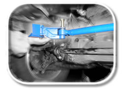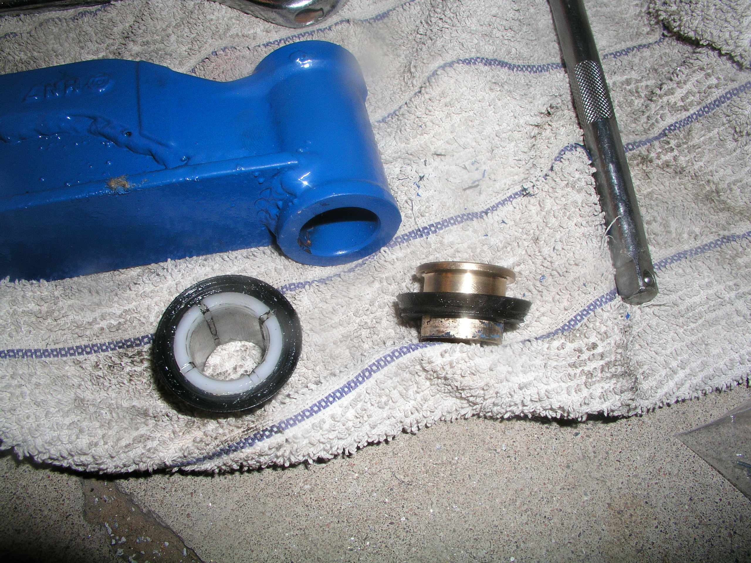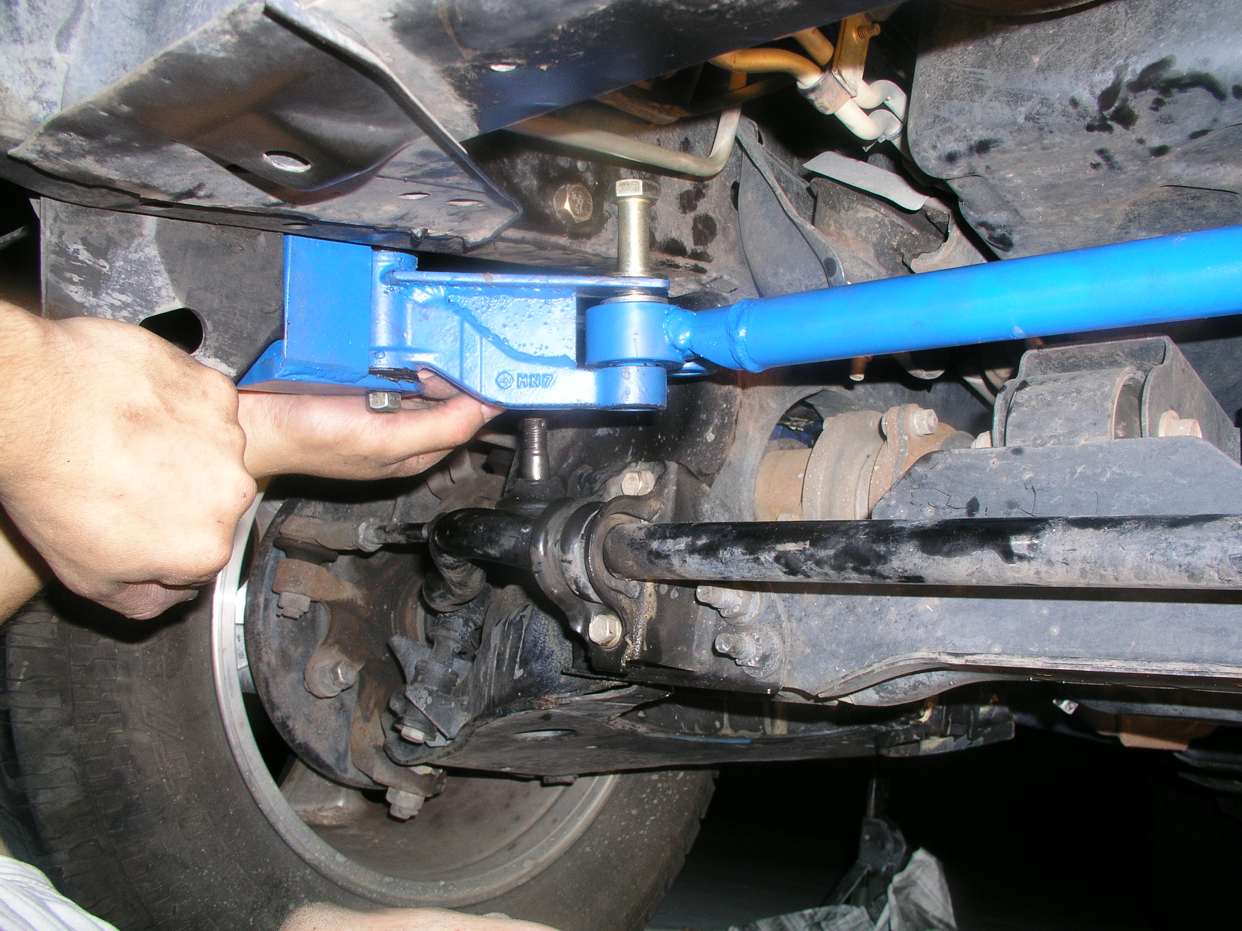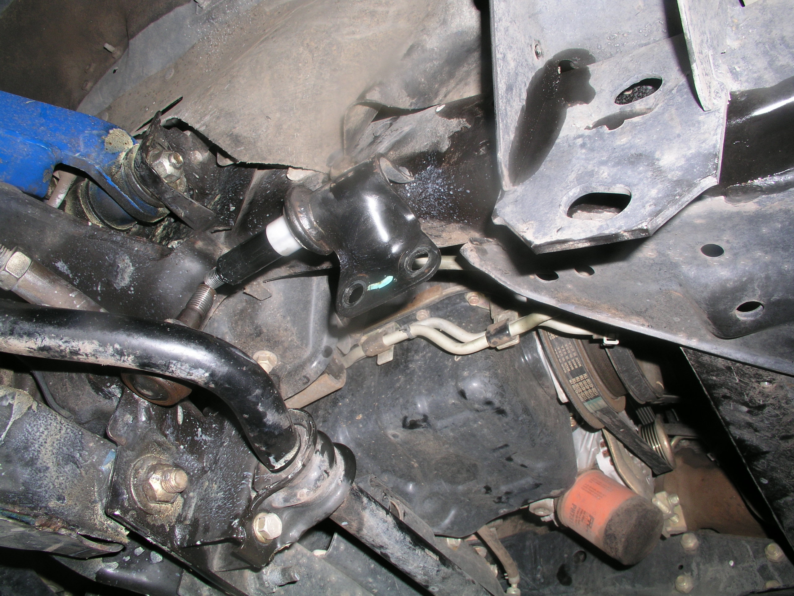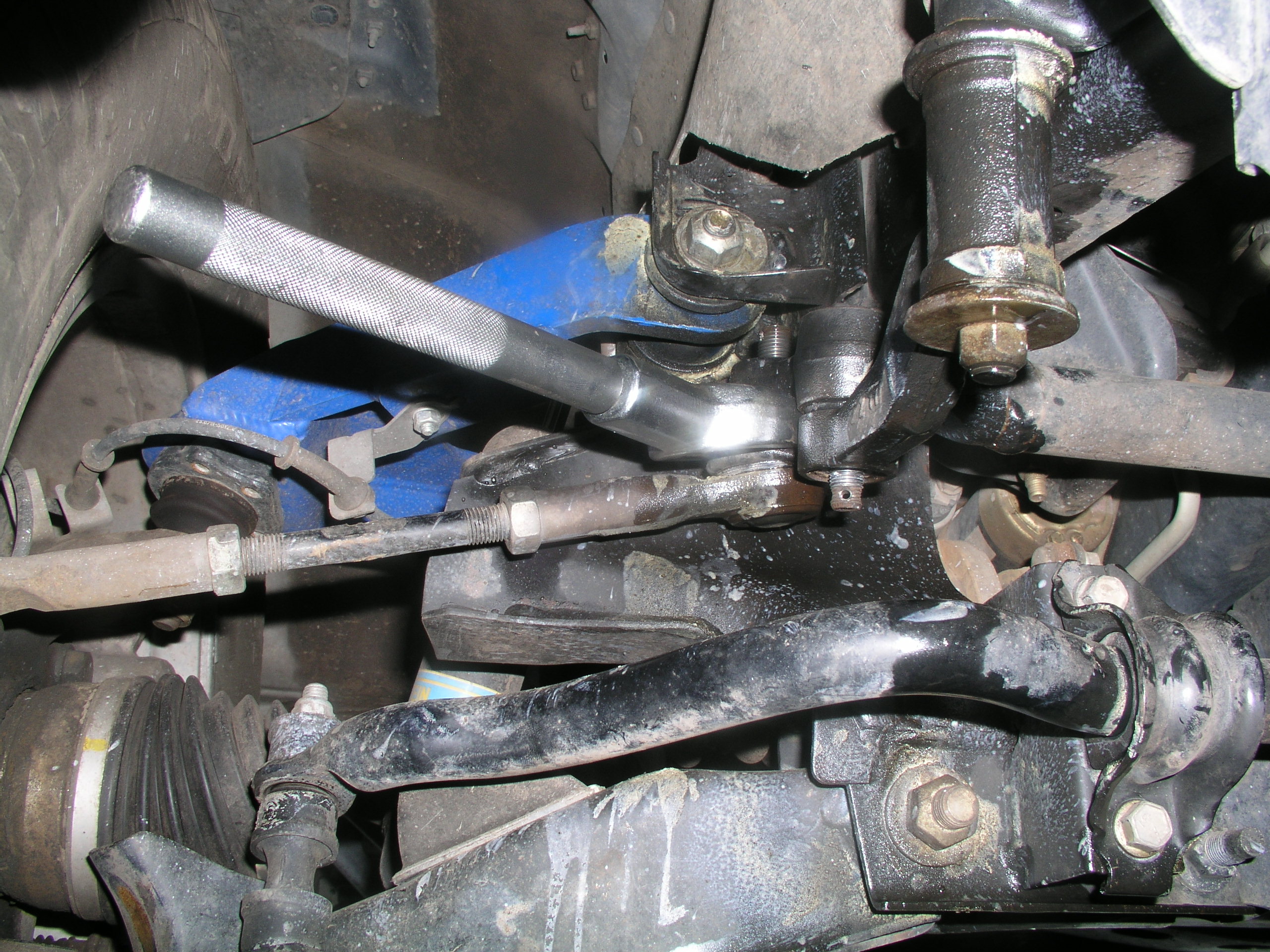 Ok, so the seemingly secretly ordered parts finally made it to my door, so I scheduled the install to coincide with my body lifting. The parts were clearly beefier than what was currently on my X. While the Calmini kit came with just about every steering component you could replace, L&P offers 3 stages of their lift. I decided on Stage 2 which came with a revamped Centerlink, Idler Arm and Idler Arm Brace. Stage 3 adds a stronger Pitman Arm but from what I read many other Xterra owners determined the stock one nearly indestructible as it was. I also added their bronze bushings to my order to replace the stock plastic ones that sat in the Idler Arm ends. This is a fairly simple install, but as I've found before, sometimes calculating the time involved in the removal of steering components can be anybody's guess. Love those factory pressed tapered ends. Well you can just take a look at the new parts you got and pretty much figure out yourself what needs to be done. In my case it was to give the new parts a quick shot of cheapo Depot blue paint to match my Calmini suspension. What's the point of buying expensive parts if no one can tell what you've added right? : )