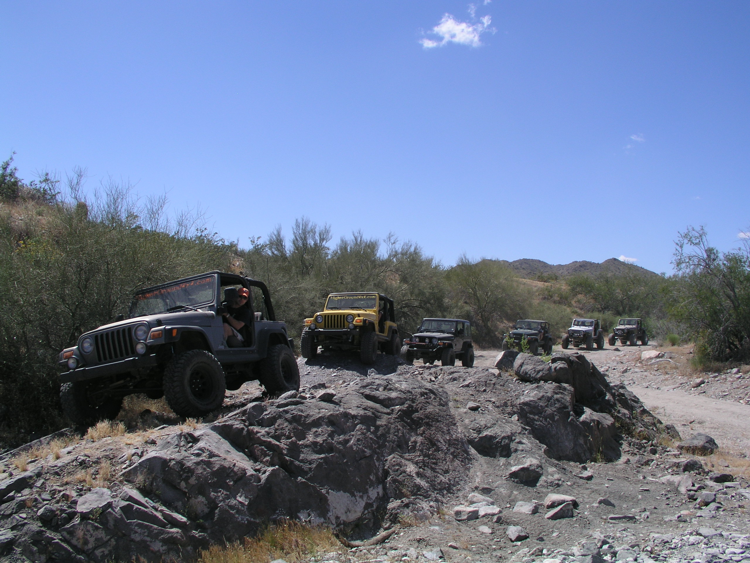| The Jeep convoy grew from the get go as Chris and Dana's Jeeps met up and then later with the help of the CB's Jared merged perfectly onto the Interstate and into formation between Chris and Dana like it had been practiced. When we got to the White Tanks we found one of Eric's friends waiting for us and him. By the time we got to deflating and discoing down, the Jeep count had significantly increased to six Wrangler and one Cherokee and another Wrangler caught up later to make an even eight Jeeps. |