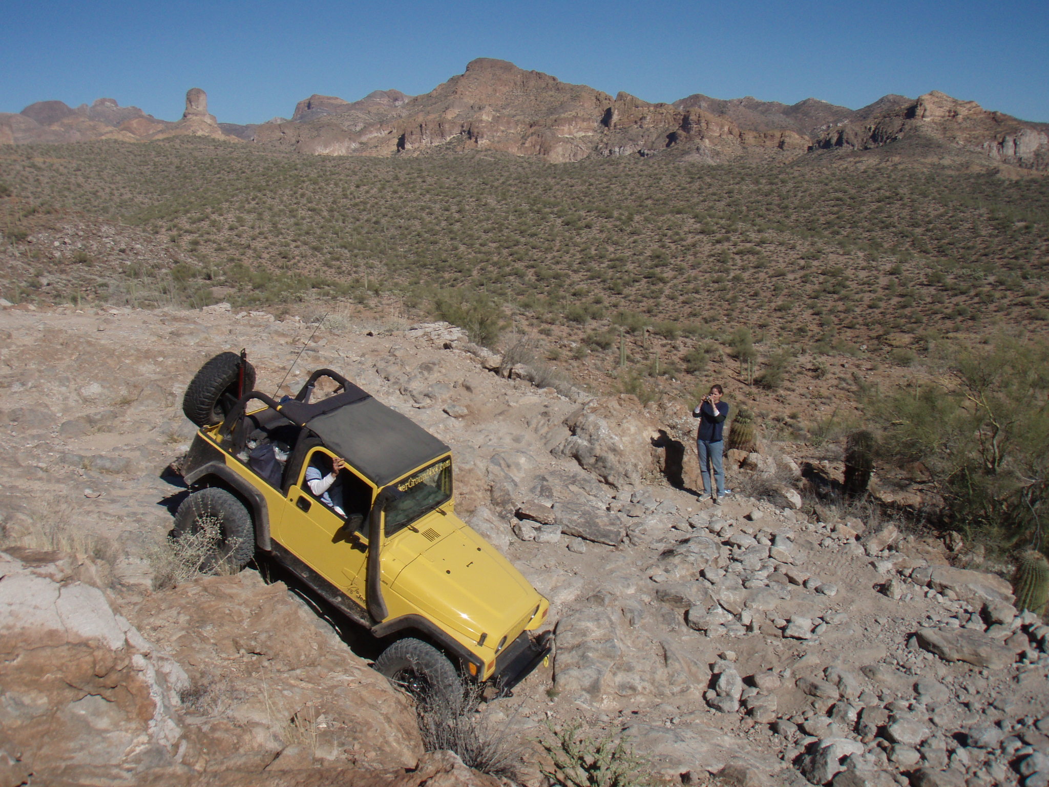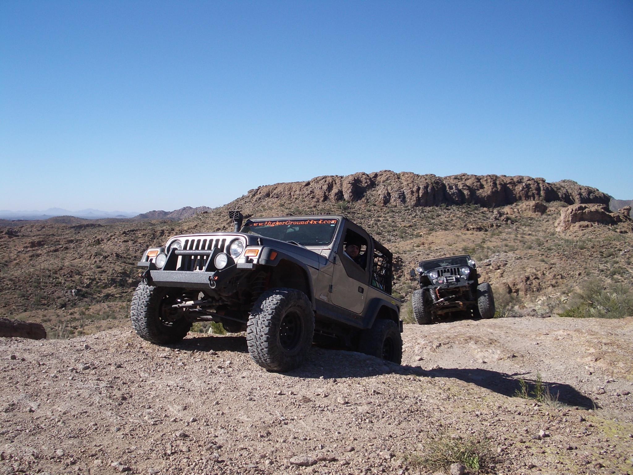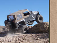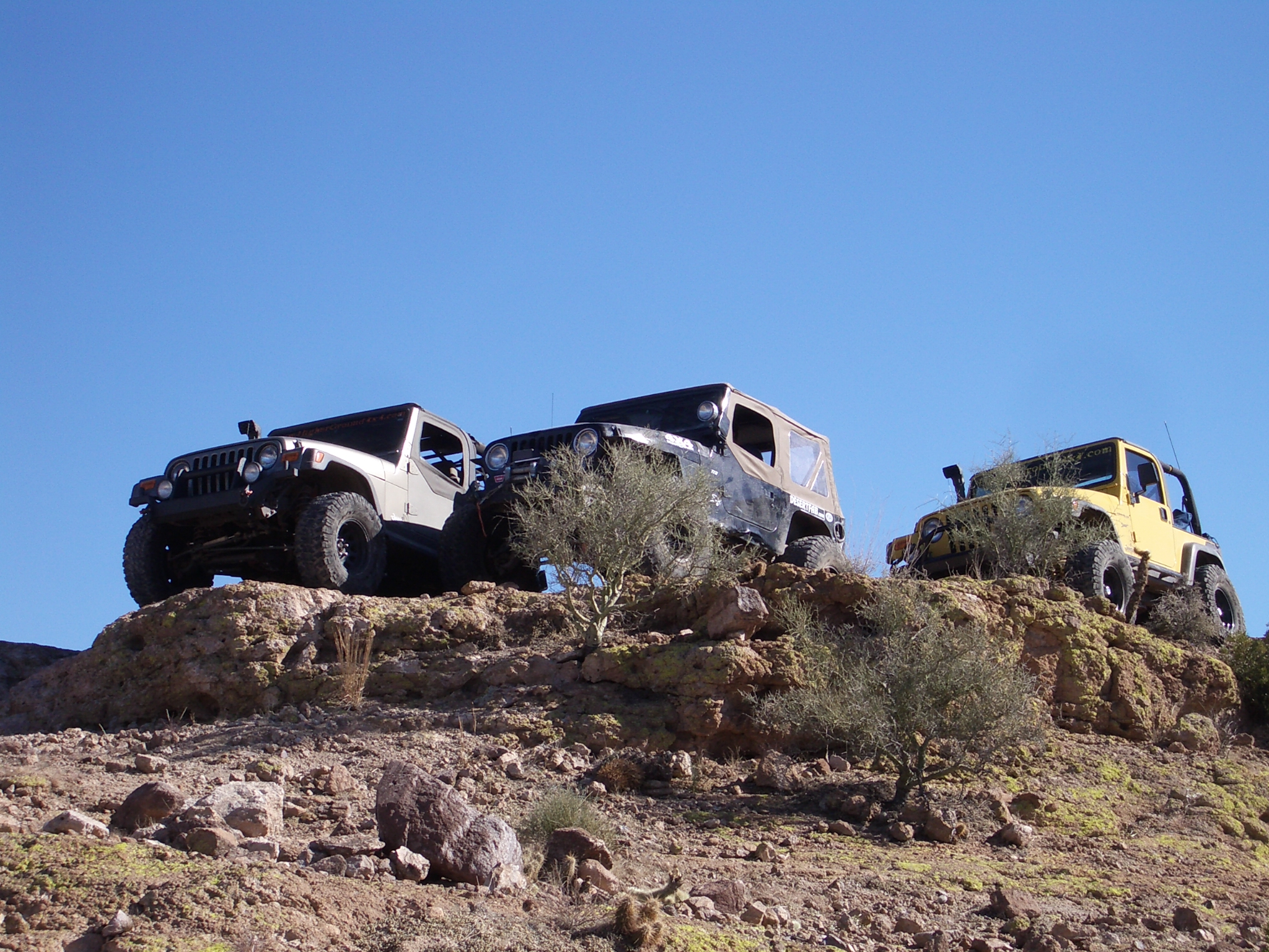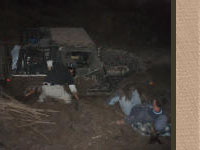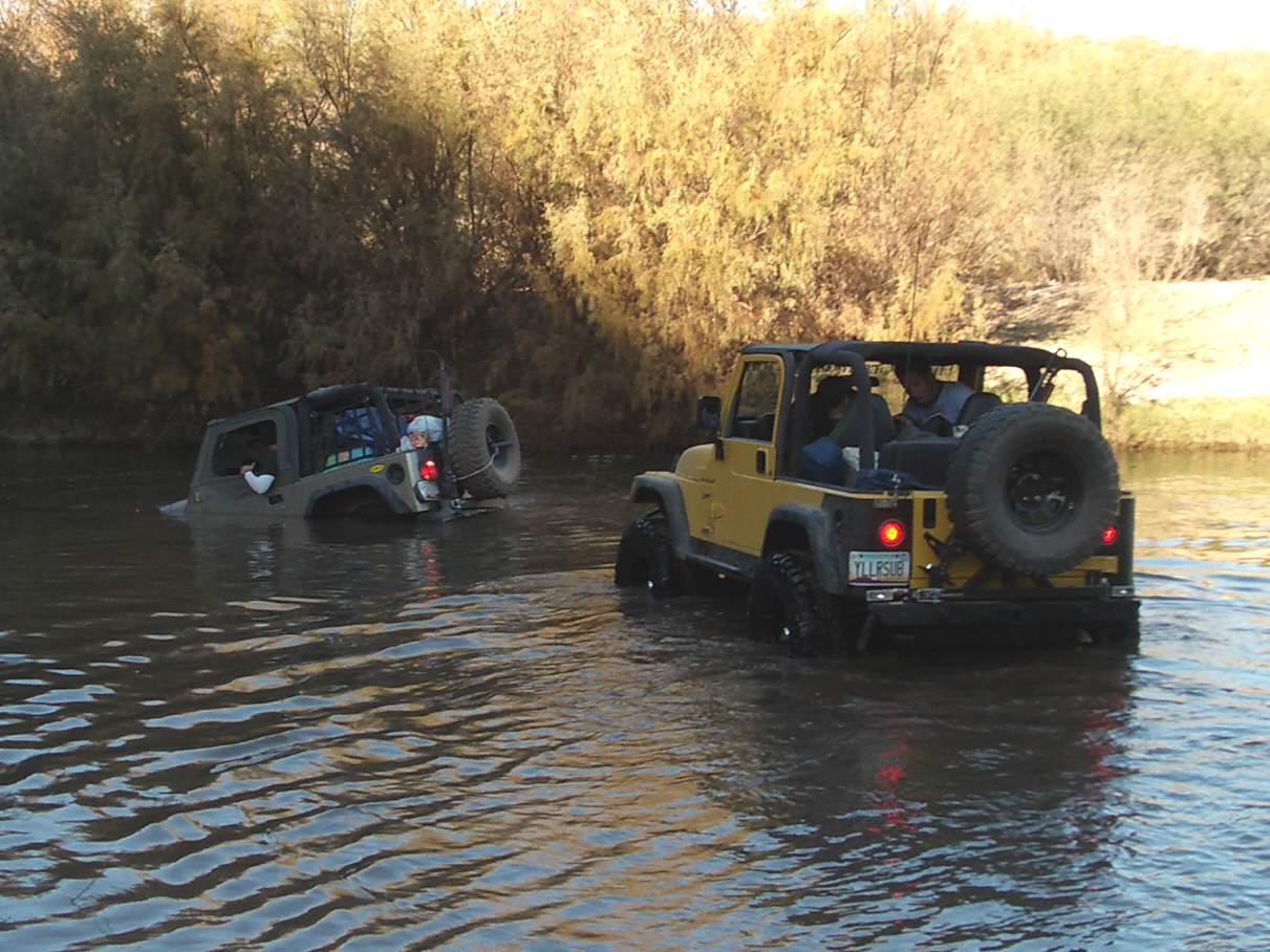 It was one of those dirty jobs that you almost realize right away no matter how gingerly you go at the task, you're going to end up covered head to toe, so you might as well just dive right in. The mud was so softly churned, we had no problem digging with our hands, save from the now almost freezing temperatures. It took a few attempts, but finally after digging down past the water table and to the bottom of J's tires, Bob was able to winch him out using Dana's Jeep as an anchor. All of this strain on J's Jeep created a new problem. Water had snuck into his Tranny via the top of his dipstick, and spinning in the mud in 4Low for that long took its toll on his drivetrain. What was left of his tranny fluid was boiling out the top of the dipstick and what remained inside wasn't enough to let his gears do their shifting. So, once again, we went about pulling a trannyless Jeep out of the Florence area. Bob, got us on the right trail on the opposite side of the river and we took Cochran Road (a wide graded trail) until it hit the F-K HWY and we found the pavement we had all looked forward to. A short drive to a Taco Bell west of Florence got us some grub and met us up with a tow truck. When the truck got there, who should it happen to be, but the same driver that took Dana's trannyless Jeep back to Phoenix when hers went out at Ajax. |  |