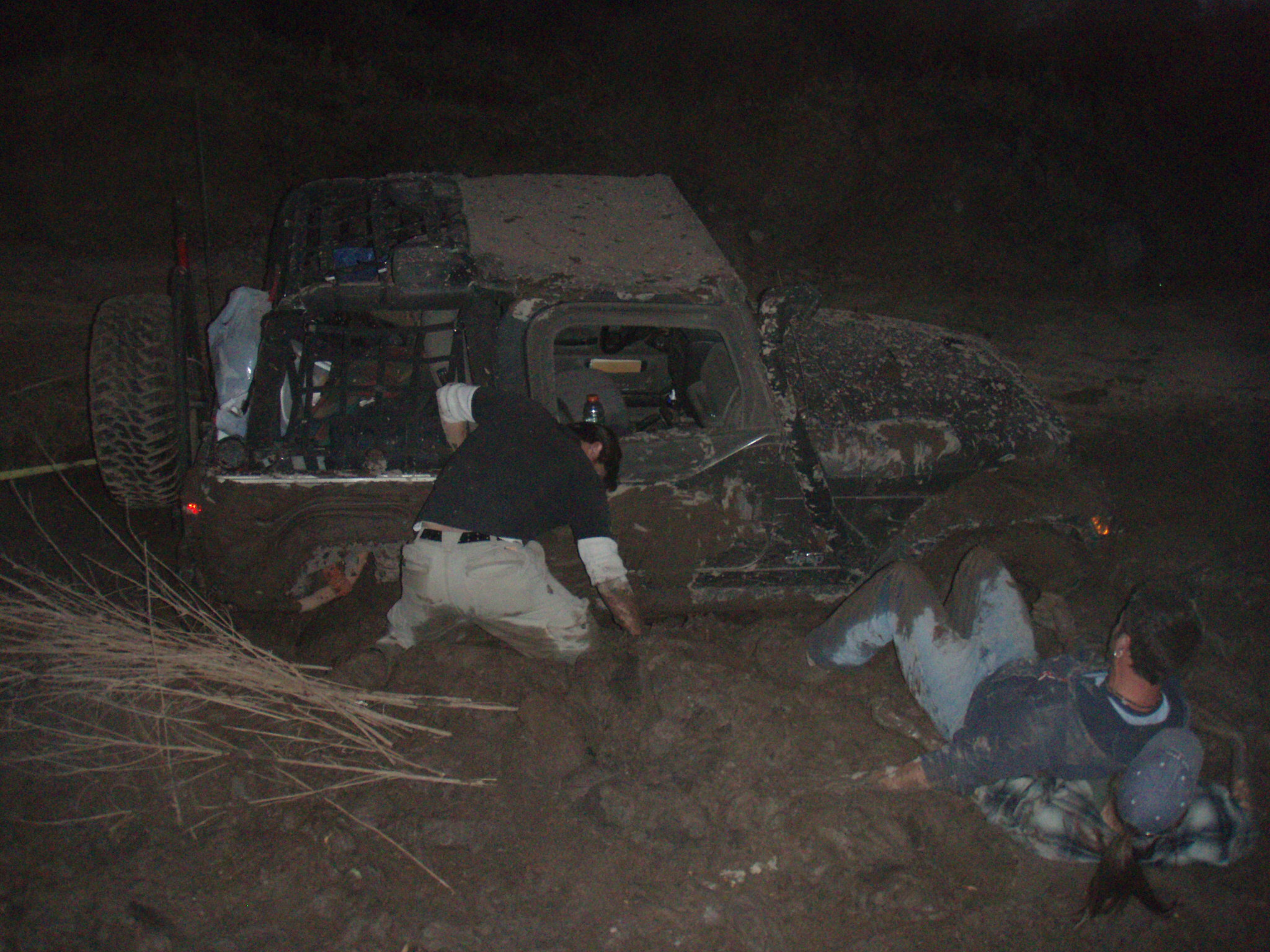 Where we came in at the river was a little off course, so we decided to head upstream a bit. Driving in the river didn't pose a problem since it never got above tire; it was the shore that was out to get us. In a couple spots, the mud just threatened to give us a run, but finally one area sunk J's Jeep to the doors. The submerged mud there was like churned butter and it just sucked him in so tight, it rendered pulling him out, double pulling him out, and winching him out useless from all angles. While the sun started getting dimmer, we had no choice but to dig him out.