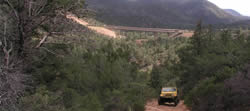 As I stood behind to guide the bumps and slides down to safety, Jared, not because of fear, but to feel the Jeep and only react to my instructions, simply closed his eyes. Now his only input was me and the gravity tugging at his wheels. It pretty much became like the Luge at Martinez: a controlled slide only once again backwards. His ears and hands did their job though and we got his Jeep off the 60 yard incline intact. We then had to face the facts that last night's rain was going to cause us to detour and backtrack. |  |