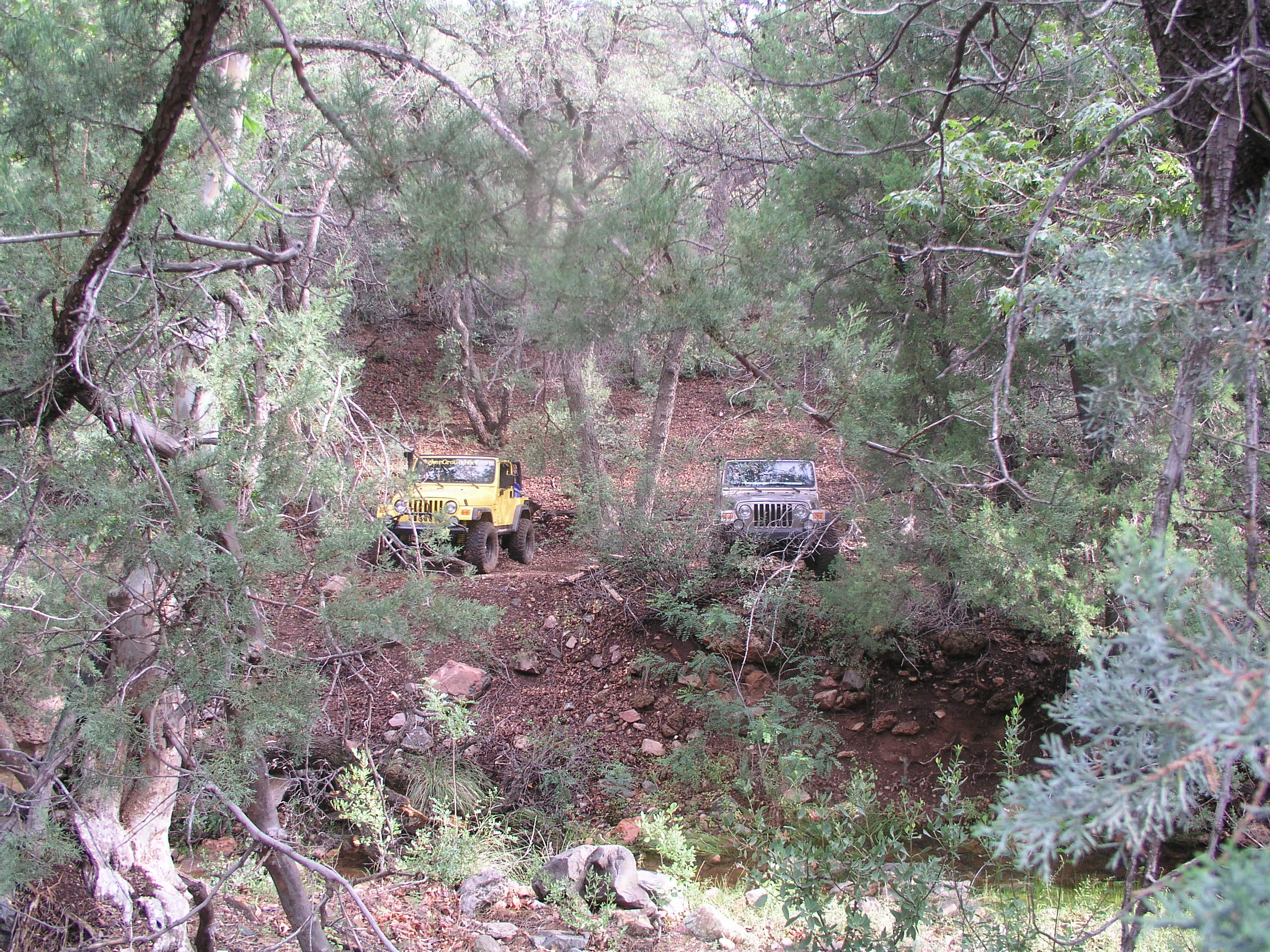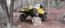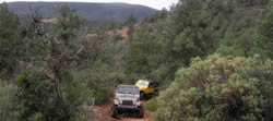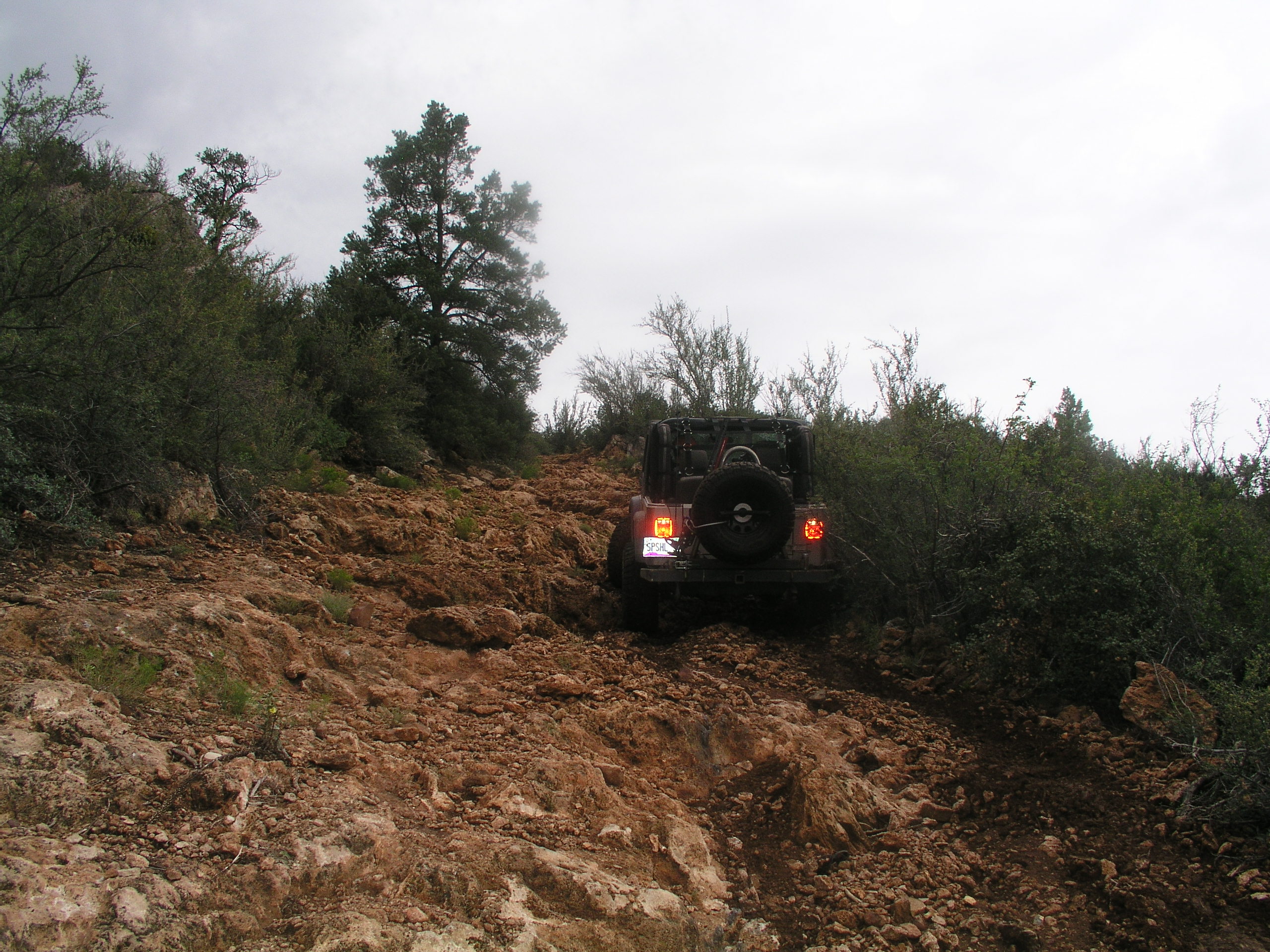 So anyway, the next morn we mounted up, tarped over all the gear in Dana's Jeep so if (read: when) we found mud it would all be covered. Then we went about completing the trail. The only problem would be that with the rain, the steep ascension up again had become loose with some large rocks providing off-camber situations. J went for it and made it up 3/4 until he forced himself to stop. You know it's bad when a Jeeper decides that instead of trying to continue up where the edge of the road is not your friend, the cliff below beckons your demise and the dirt itself is mocking your defeat, he will instead have to drive down that very same trail backwards. -Another time for me to step in and play coach to a team that cannot loose.