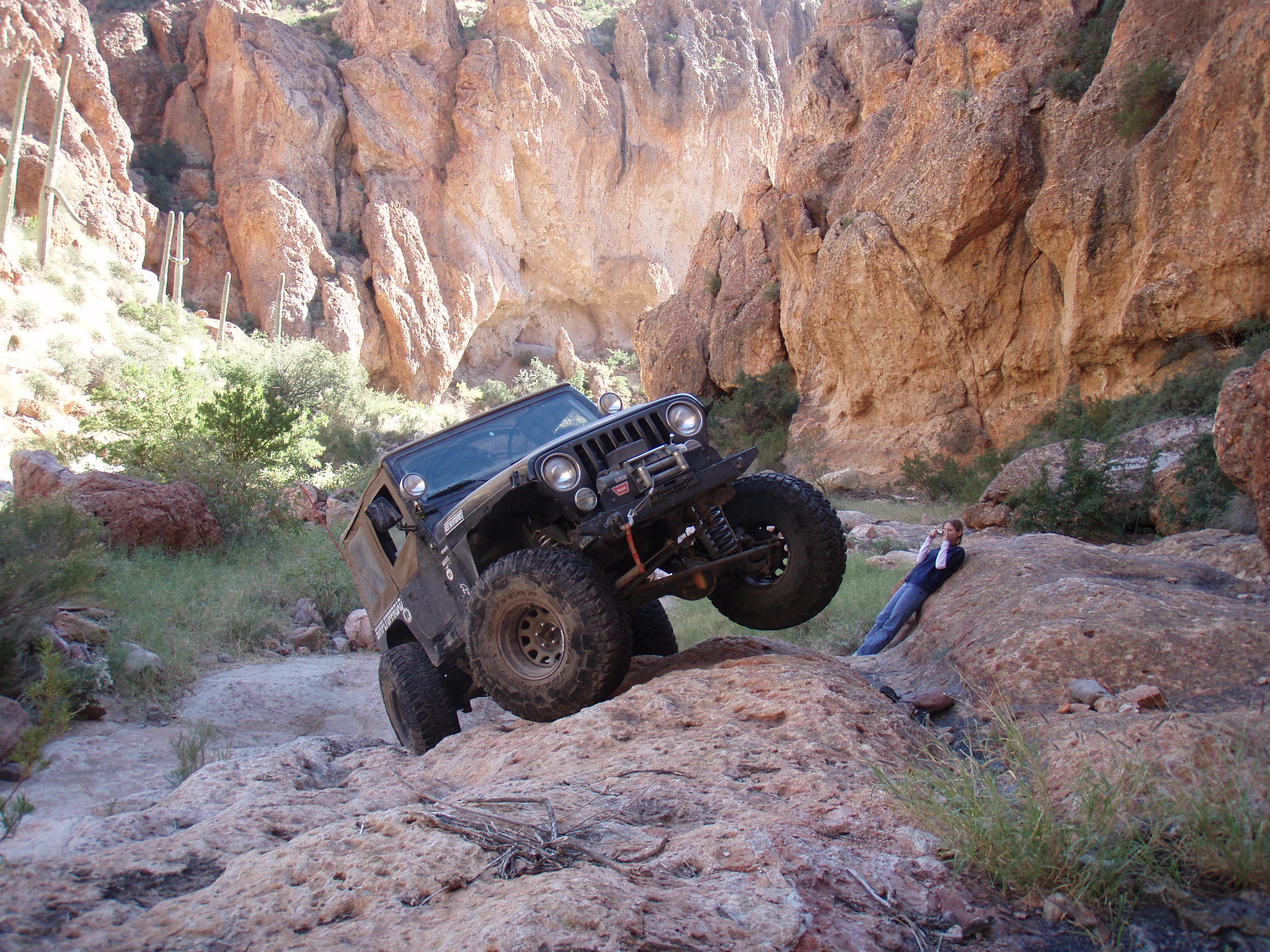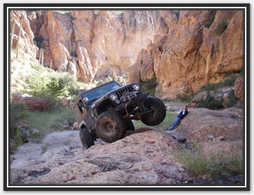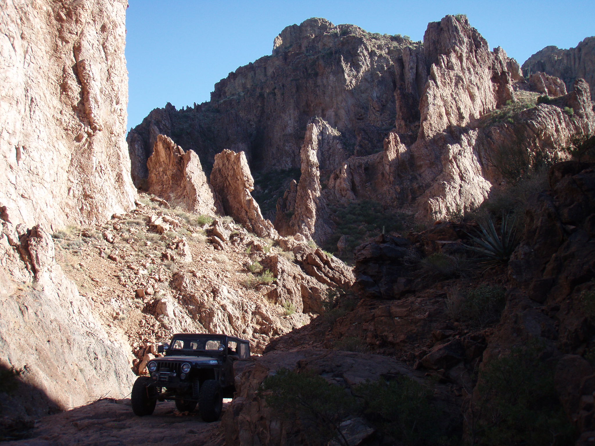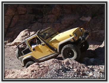 Well, it took a passel of hassle, but most of us were able to get our rears in gear and make it back to Martinez. We were delighted to have our new, yet old in the saddle friend, Bobert make the run with us. It had been a few years since he had been there, and I had been on a couple of trips before, but Jared and Dana hadn't driven the loop yet (for the record, J did play gear hauler in his stock Frontier to the cabins a while back). We took the weekend off and planned to hit Martinez Saturday, camp overnight, and then run to Coke Ovens, taking the Gilla out. The desert trail was pretty crowded out until we got to the Cabins. There was a circus of random vehicles rethinking the rain washed trail just south of the Cottonwood Canyon lead in. It was obvious they were having a tough time when they all gaped at us passing by at our leisurely clip. Everything was pretty uneventful all the way to the WH cave where we lightened our load by dumping off our camping gear. As always the greener and wetter spots in the start of the canyon, provided some very nice photo ops. I was grateful that J's Jen was there to help out with pics too as Martinez always photographs well with its scenic back drops and jagged lines. After the cabins, they put it in low and went out in search of trail obstacles. Martinez, while not filled with over the top rated attractions, has plenty of rocks to be negotiated all along the way. Many people just call it a day after reaching the old mine structures, or even just at the cabins. As long as you have the clearance and flex for it, it's pretty much just a matter of staying on top of things. The rain hadn't put as much of a hurting on the trail as Ajax, but it was still evident. The various rock gardens sprung out at the Jeeps pretty strong, and were assuredly larger than we had remembered. Everyone still did pretty well on the trail, a few snags from underneath here and there. More outside help was necessary as I shirked my spotting duties and scampered off to play mountain goat to get different shots of their progress from ahead and above. The Jeep drivers took turns leading, chose their own lines, put out their helping eye for one another, and at least from an elevated position, made it all look gracefully doable (especially Bob hunkering on his 37's). While everyone had their own picture worthy styles, Bob also took a couple noteworthy chances to test out his maximum tippage point- without incident to the camera's dismay. The mine building came quickly enough, but it was the switchbacks that required the double pedaling (pun intended). The season's monsoon storms had rutted out some nice footprints on the 750ft twisted climb to the top, and one off-cambered moment did manage to launch one of Bob's rear springs off. It took some doing to get it back in, but a hi-lift finally got us a moving again. Later on during the ascent, a rope and some weight shifting was needed on Dana's Jeep (wasn't her driving), to keep her Jeep moving forward and not... well, over the side. When we got to the Silverbell/ Columbia mine conglomerate, a few of us explored the levels and managed to find our way in one hole and out the other. We didn't spend too long there this time, because the sun was racing us to camp. At the summit we were just in time to shoot a great multi-wranglered sun down shot that'll definitely go in our keepers book. We took the Luge bypass (which seemingly is becoming the new Luge), at almost full dark so the camera couldn't capture the Jeeps sliding down. I did notice by headlights, a couple Jeeps almost side walling on the way down though. Once we were all grounded again, we found our way back to our camp stuff, and half of us gathered wood while the others set up camp. It was supposed to be low 30's in nearby Florence, and even though we were in a damp canyon, experience had taught us we'd be fine with a fire in the cave hollow. In fact, we stayed cozy in regular shirts from fire until dawn. When we woke in the morning, we packed it up and headed out toward the Cokes. | |