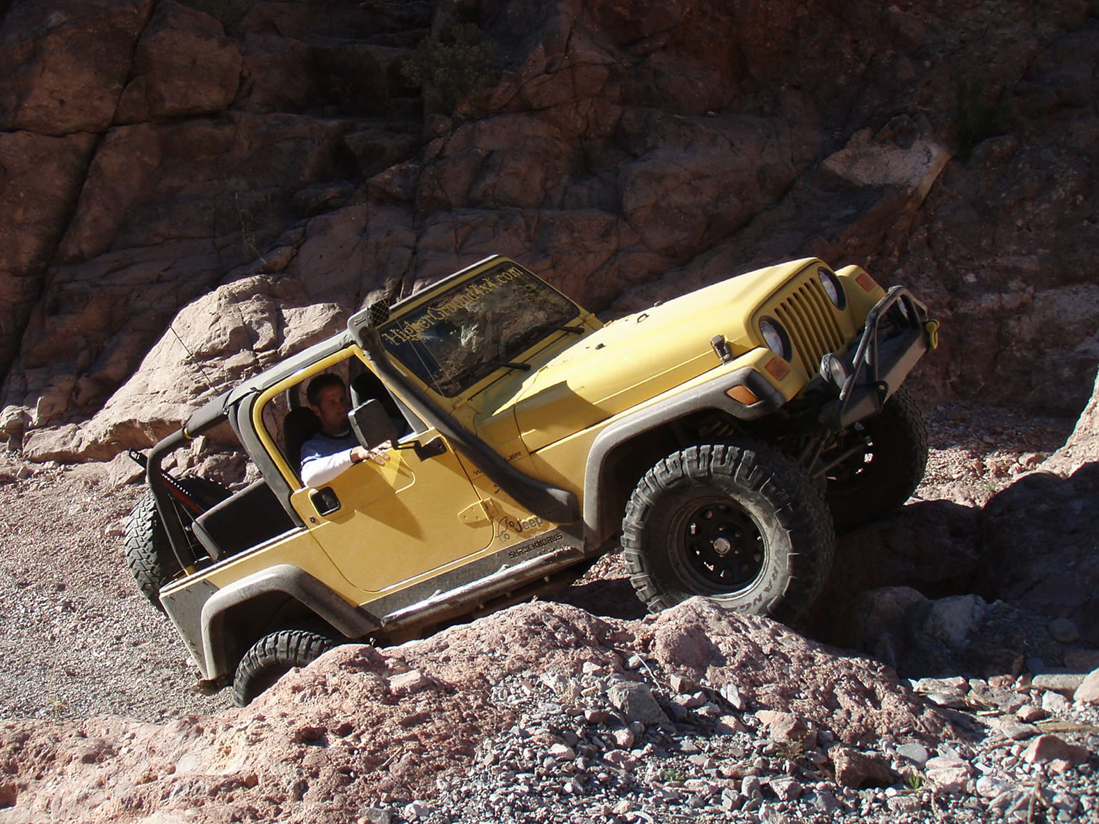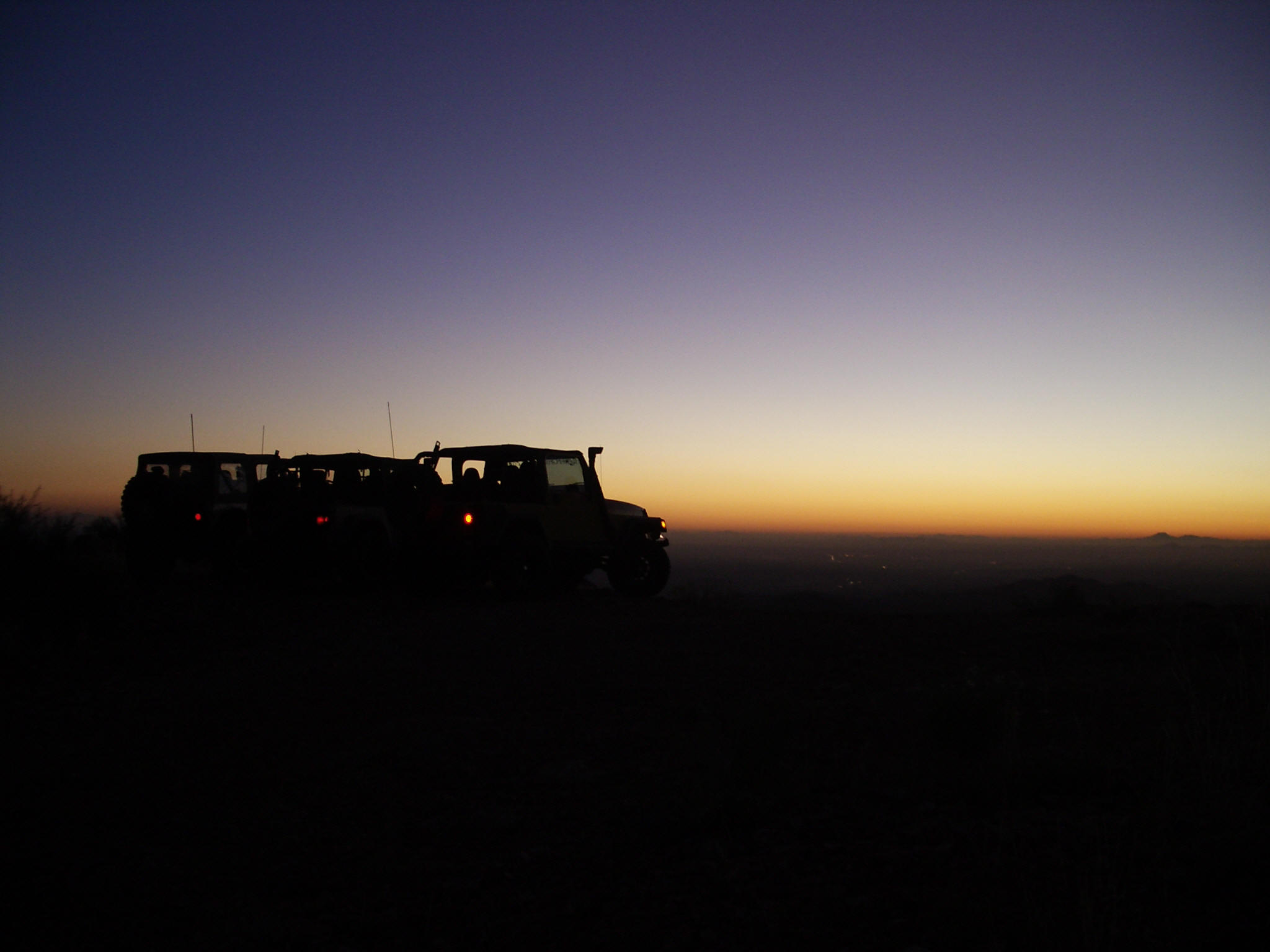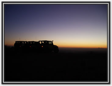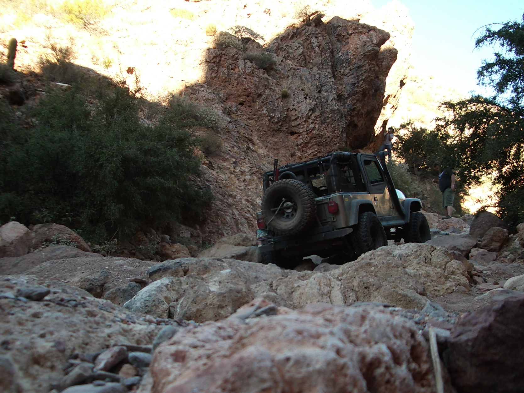 Well, it took a passel of hassle, but most of us were able to get our rears in gear and make it back to Martinez. We were delighted to have our new, yet old in the saddle friend, Bobert make the run with us. It had been a few years since he had been there, and I had been on a couple of trips before, but Jared and Dana hadn't driven the loop yet (for the record, J did play gear hauler in his stock Frontier to the cabins a while back). We took the weekend off and planned to hit Martinez Saturday, camp overnight, and then run to Coke Ovens, taking the Gilla out. The desert trail was pretty crowded out until we got to the Cabins. There was a circus of random vehicles rethinking the rain washed trail just south of the Cottonwood Canyon lead in. It was obvious they were having a tough time when they all gaped at us passing by at our leisurely clip. Everything was pretty uneventful all the way to the WH cave where we lightened our load by dumping off our camping gear. As always the greener and wetter spots in the start of the canyon, provided some very nice photo ops. I was grateful that J's Jen was there to help out with pics too as Martinez always photographs well with its scenic back drops and jagged lines. After the cabins, they put it in low and went out in search of trail obstacles. Martinez, while not filled with over the top rated attractions, has plenty of rocks to be negotiated all along the way. Many people just call it a day after reaching the old mine structures, or even just at the cabins. As long as you have the clearance and flex for it, it's pretty much just a matter of staying on top of things. The rain hadn't put as much of a hurting on the trail as Ajax, but it was still evident. The various rock gardens sprung out at the Jeeps pretty strong, and were assuredly larger than we had remembered. Everyone still did pretty well on the trail, a few snags from underneath here and there. More outside help was necessary as I shirked my spotting duties and scampered off to play mountain goat to get different shots of their progress from ahead and above. The Jeep drivers took turns leading, chose their own lines, put out their helping eye for one another, and at least from an elevated position, made it all look gracefully doable (especially Bob hunkering on his 37's). While everyone had their own picture worthy styles, Bob also took a couple noteworthy chances to test out his maximum tippage point- without incident to the camera's dismay. The mine building came quickly enough, but it was the switchbacks that required the double pedaling (pun intended). The season's monsoon storms had rutted out some nice footprints on the 750ft twisted climb to the top, and one off-cambered moment did manage to launch one of Bob's rear springs off. It took some doing to get it back in, but a hi-lift finally got us a moving again. Later on during the ascent, a rope and some weight shifting was needed on Dana's Jeep (wasn't her driving), to keep her Jeep moving forward and not... well, over the side. When we got to the Silverbell/ Columbia mine conglomerate, a few of us explored the levels and managed to find our way in one hole and out the other. We didn't spend too long there this time, because the sun was racing us to camp. At the summit we were just in time to shoot a great multi-wranglered sun down shot that'll definitely go in our keepers book. We took the Luge bypass (which seemingly is becoming the new Luge), at almost full dark so the camera couldn't capture the Jeeps sliding down. I did notice by headlights, a couple Jeeps almost side walling on the way down though. Once we were all grounded again, we found our way back to our camp stuff, and half of us gathered wood while the others set up camp. It was supposed to be low 30's in nearby Florence, and even though we were in a damp canyon, experience had taught us we'd be fine with a fire in the cave hollow. In fact, we stayed cozy in regular shirts from fire until dawn. When we woke in the morning, we packed it up and headed out toward the Cokes. | |