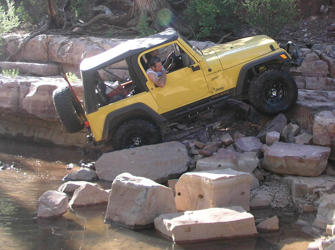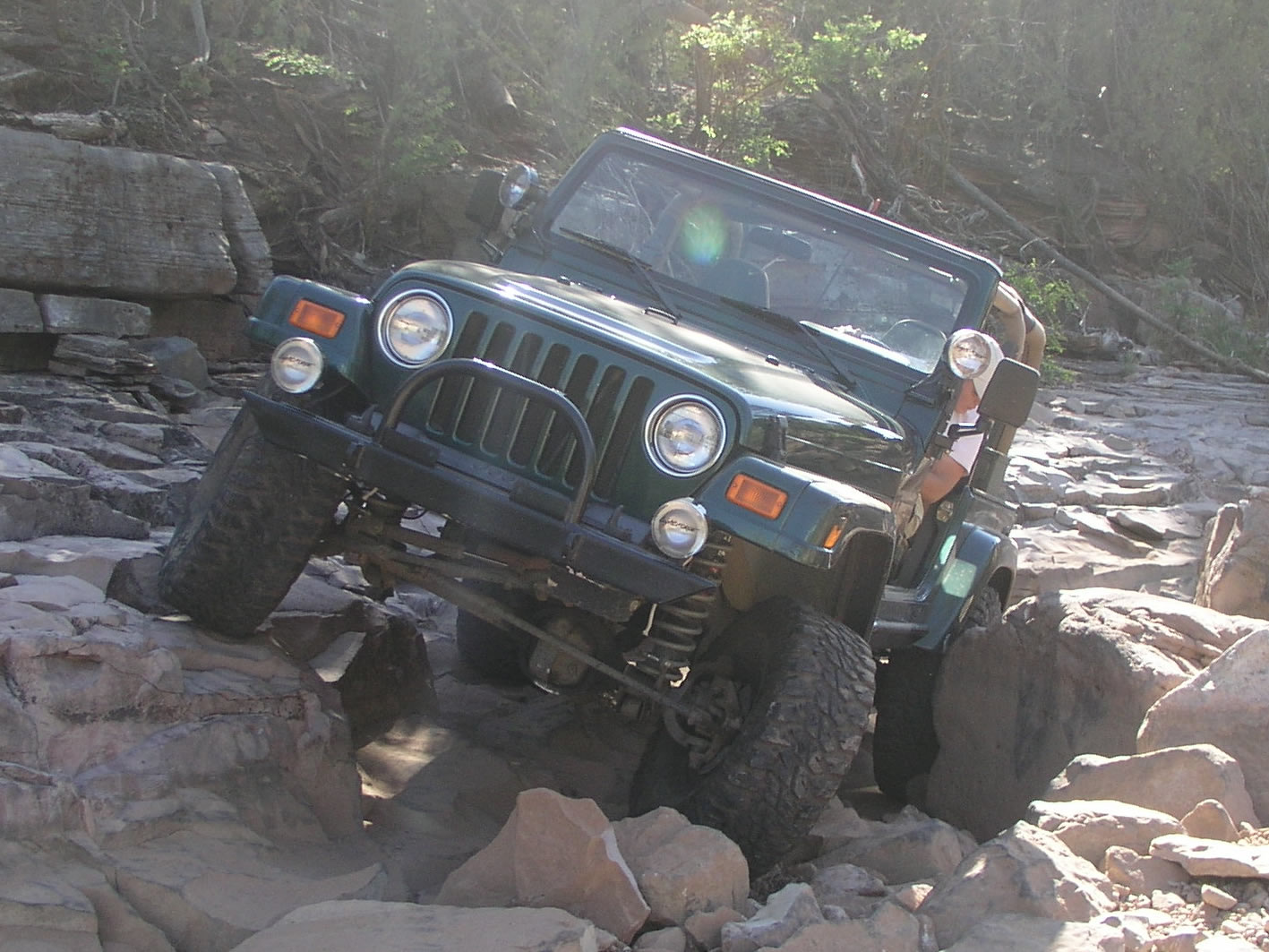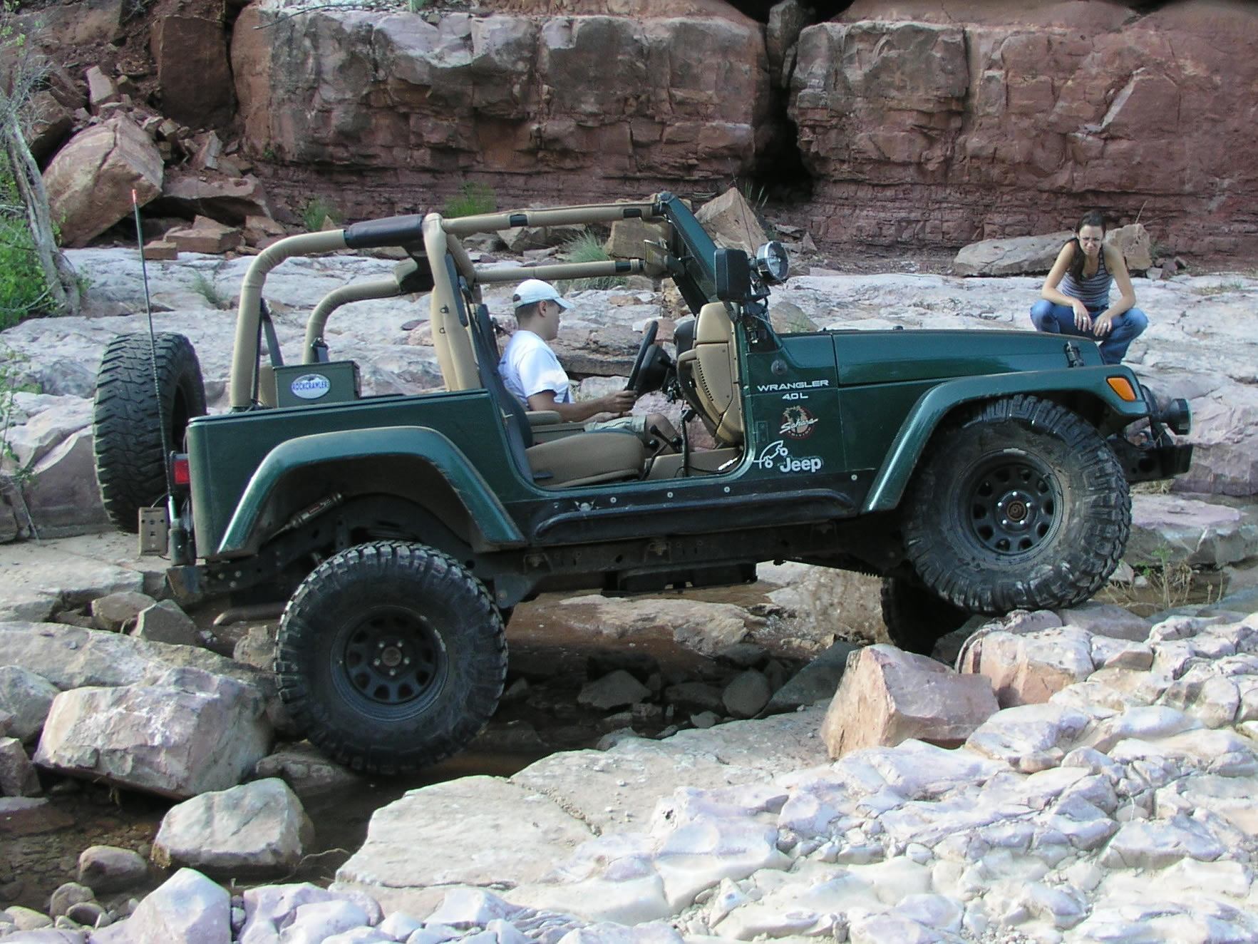 Okay, it's summer in Phoenix, which means it's either time to throw in the playing outdoors towel or to get the heck up to higher altitudes in hopes of double digit temperatures. So this past Sunday after church we did just that and took the Jeeps up to Payson to play. Our destination was Pyeatt Draw, a creek bed trail Chris found a few miles NE of the city. We found the right trail with out too much difficulty. We tried some online directions first that just had us scenic driving along a fence row along the top of the hills, but we finally found the "real" trail down in the canyon. This trail had quite a lot to offer. There was always a little trail just up the hill that winded through the creek every once and a while that allowed obstacle bypasses, but we only used it near the end to get out. Dana actually came out with her Jeep and her new brother approved beau to give the trail a shot. And since this trail was easily harder than Sycamore Creek (which we wondered if she'd be okay on), she ended up doing lots better than just okay. She kept right in pace with Chris, even trying her own "I wonder?" spots. Both open diff Jeeps were constantly put to the test with the many ledges, large cracks, and wet rocks, but only one hole we found required a tug out of. Chris and Dana both found themselves in the air a couple times and on one of the more tricky spots, Dana's Jeep got pretty tippy, so we strapped her Jeep and pulled a little to keep it leaning the right way. The leverage I was able to give with the rope was enough to sway her Jeep at least a foot tire to ground. All of their skid plates and armor really took a beating during the course of the day and more than once, setting it down on the bumper was required. The only part they passed on was near the end where a winch would've come in handy. I made the mistake of showing Chris a picture of a Jeep on its side at that spot, but he said when he gets his full cage, he'd give it go. This was another great run, and even though they pushed the limits pretty far this time and played on some obstacles just for the camera's sake, they left with all the tools still wrapped up and all their parts in tact. | |