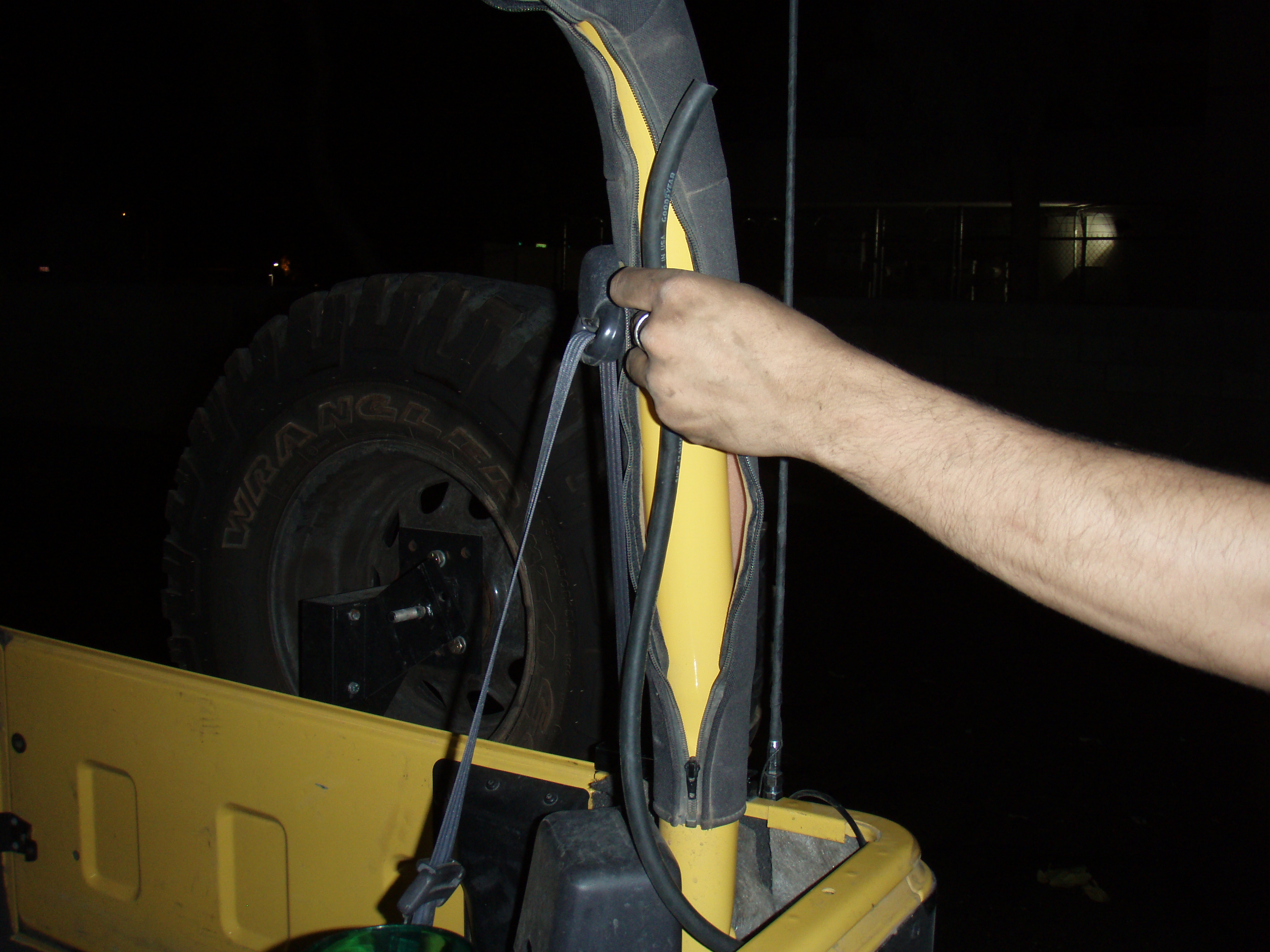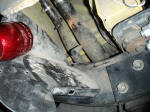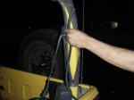 The last hose, comes of the rear axle and runs along the gas tank line into the hollow behind the break light. Again, not too bad, but still underneath and a easy pocket for water to find, provided the depth was great enough. We just made a cross cut in the rubber gasket that the brake light wires follow from atop the tub, and poked our extension through and ran it up the readily accessible roll bar, hiding it underneath the padding.