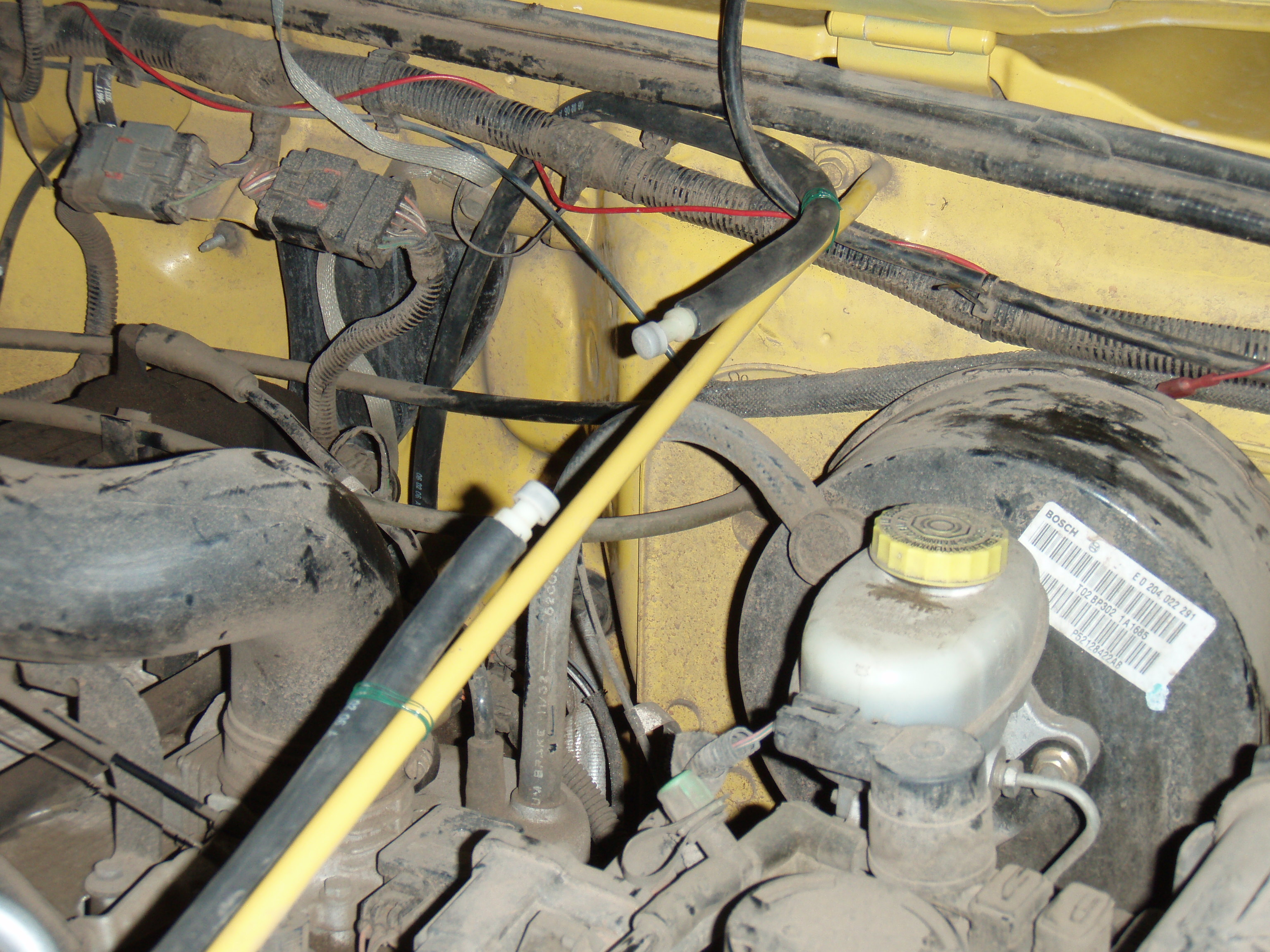 The axle hoses are run pretty high up already, but it's always better to be safe. The front one is the most visible, located along the driver side of the radiator, meeting it at the top. Not too bad, but if water should come over and into the hood, it's the first thing to dip and hit. The ultimate way to run the hoses would be to route them high into the cab, but we just extended this one along the engine compartment horizontal support bar.