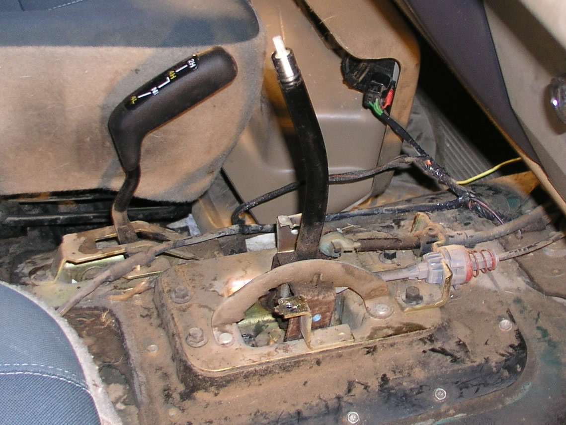 the tranny, carefully guiding the shifters through the floorboard.
