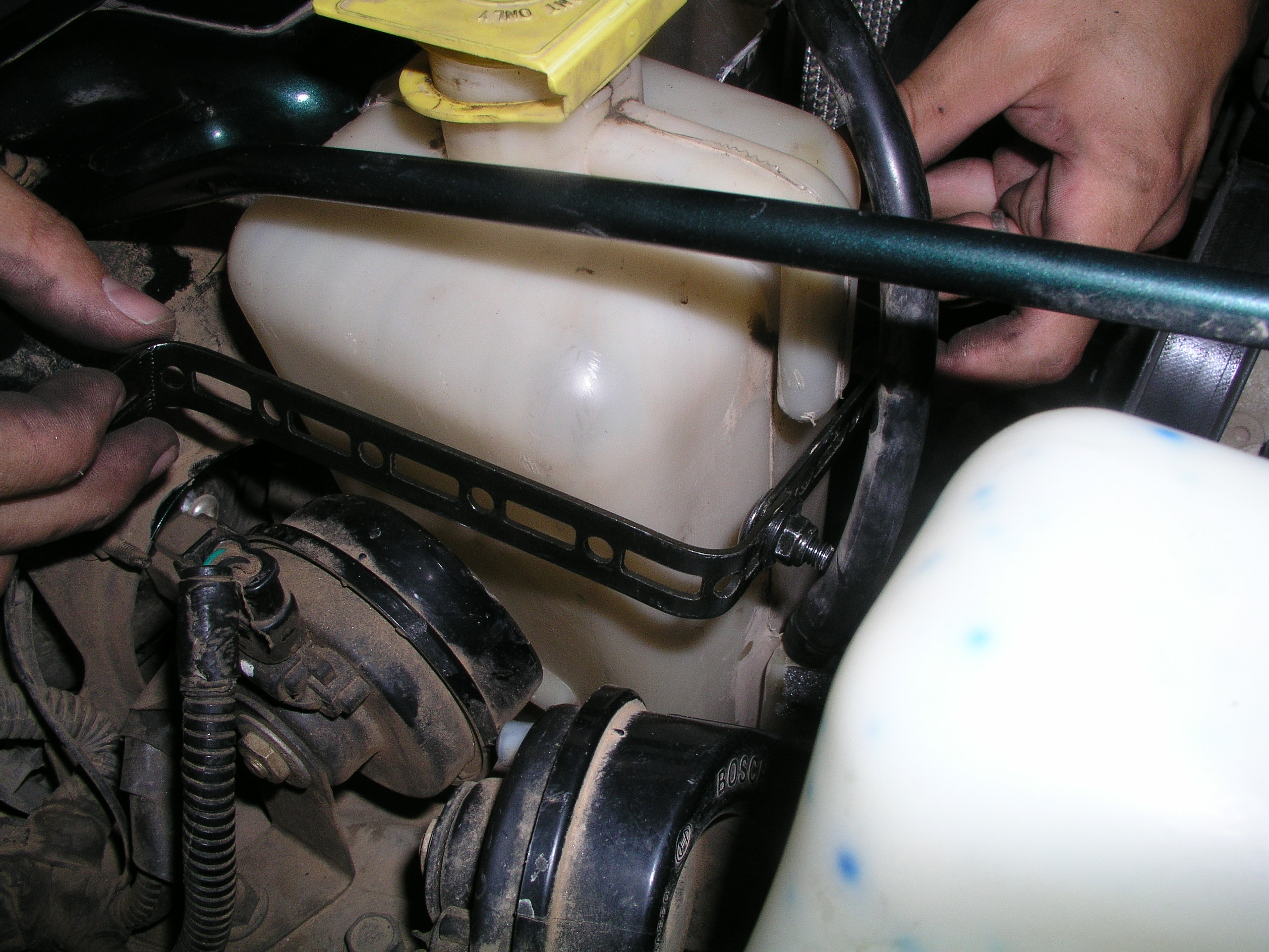 You still have to use your old reservoir, and we found it squeezed in pretty well alongside the new rad.  We "fabricated" a quick bracket out of the extra straps we had gotten with the fan but any metal strapping would be fine.  After hooking up our bracket we were sure the bottle wasn't going anywhere.  We also added a strip of foam gasket between the rad and res to prevent too much rubbing.