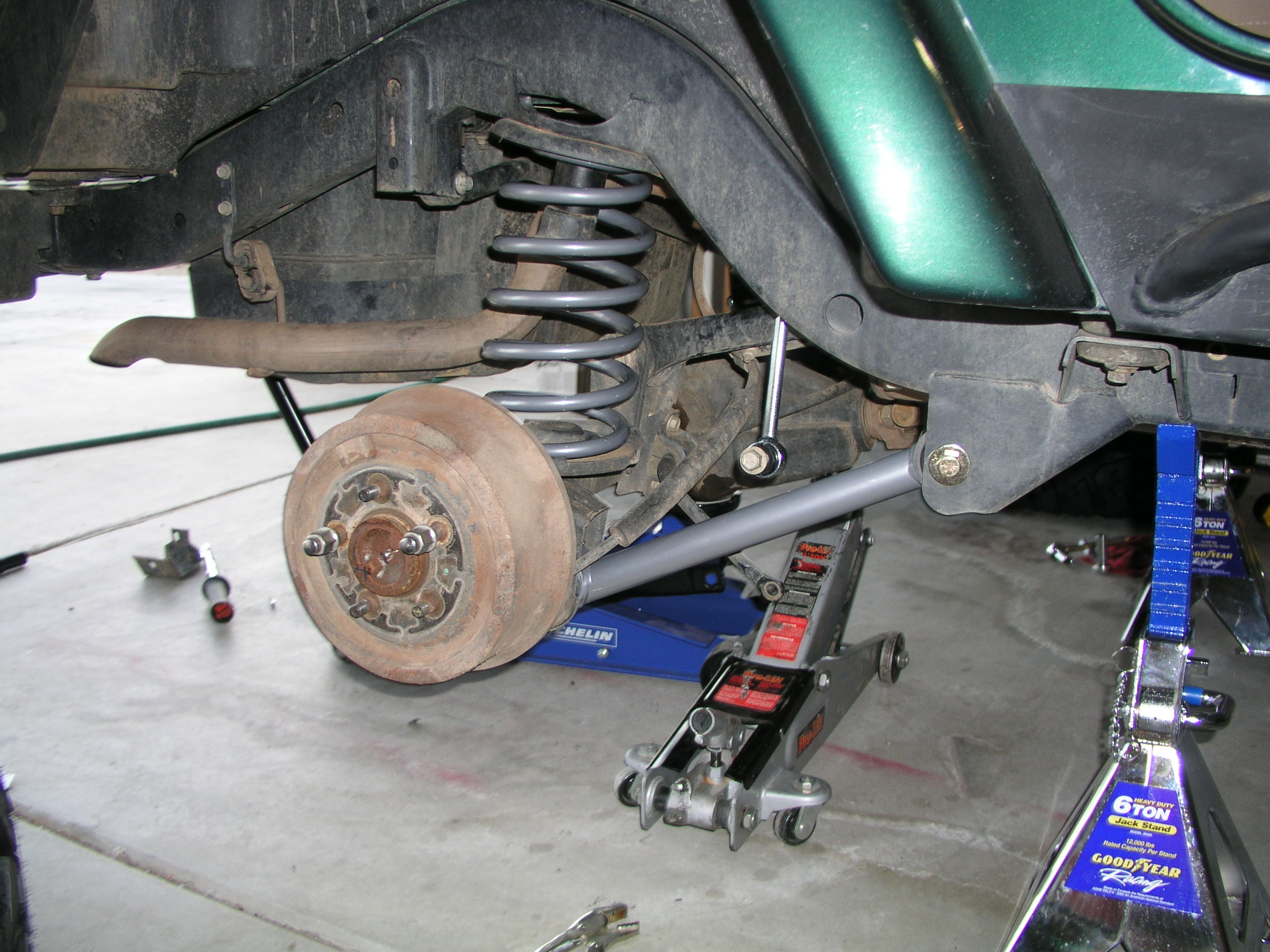 | Okay, now there's just the rear left to do. Now that you've figured out the best way of manipulating the axle to make room for the newer longer parts, it should go smoother and faster. You're basically going to follow the same steps that you did for the front. You have the shocks removed already, so yank of the rear sway bar links. You can then remove the axle end of the rear track bar and get rid of the rear lower control arms as well. You're going to have to drill a couple holes for the new track bar drop bracket and then hook it back up to the new location. The new control arms are the next step. We had to "adjust" the brackets for them, because they didn't fit quite as well as the old ones, but after some bending they cinched up fine.