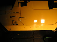 It was time for the third Jeep (Dana's new TJ) to get the Rocker Panel treatment.  Chris had gone with the Poison Spyders, and Jared with the Blue Torches.  We usually try to go with something different than one of our other Jeepers has.  Guess we'd rather spread the money and the brand names around.  Plus it's fun to customize to ones own likings and then to compare them all in the end.  We liked the slider/step bar that came on the PS guards, but then BTF included support brackets where their guards mounted to the body.  Also, the more coverage the better, so the more metal included to protect our Jeeps and wallets is an obvious plus.  Both the PS and the BTF guards had plenty of bottom coverage as well as side protection (with the BTF offering a little more underneath).  Based on the performance of these guards we wanted something similar in design and that turned out to be Shrockworks' Sliders.  Their guards not only offered the side bars and complete protection underneath , but utilized 3 backing plates to reinforce the mounting through the floor.  So seeing the best of both worlds in their design we jumped at them and had them sent out immediately.  Also in keeping with the other Jeeps' guards, we requested the Shrockworks logo be laser cut into the side as well.