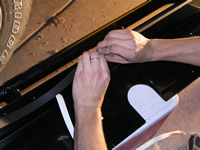 Before we mounted the rockers on the body, we took the time to put a strip of weather-strip tape near the top of the guard.  This helps prevent elements from getting between the guard and body of your Jeep so they don't sandpaper your paint off and then rust it.  We used a 5/16 x 3/4 strip but next time I would use a strip that wasn't as thick.  You can also use silicone caulk for the job.  We ran a bead of black on the top of Jared's and it turned out good as well.