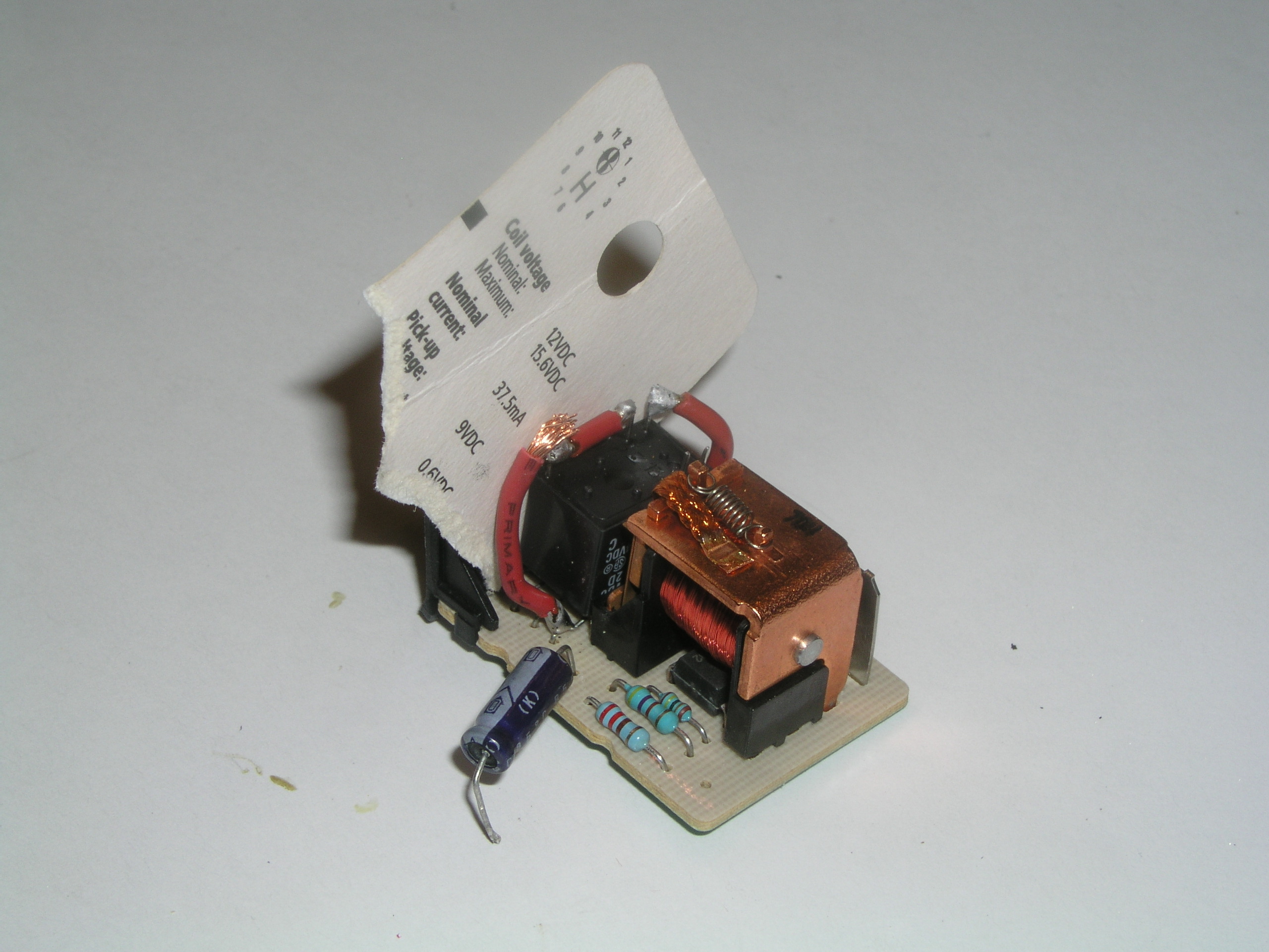 #4 For the next connection, I jammed a piece of paper between the relay and the switch front to keep the relay and secure and to keep from melting the plastic. And then since holding your solder, the iron, and the wire steady in place can be a tough trick I rigged up a helper. |