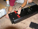 Before we began the actual install of the console, we set it up and figured out how we were going to mount the CB. The Uniden Pro250XL is a pretty compact unit so it almost swam in the large Tuffy compartment. We used the original CB mount with the addition of some longer bolts and spacers (large nuts) to center it in the compartment to where we wanted it. We then placed the mounting bolts through the grill (we painted them black of course) to secure it down. I convinced J to let me make a "custom" face for his CB, so it would stay centered, look clean, and keep clean as well. We just used some thin 1/4" scrap board, measured a million times and then curved the edges so it would fit flat against the inside of the compartment. We actually cut it so perfect that the face alone instead of the mount would keep the CB from bouncing around. We then used the next best thing to duct tape, spray bed liner to paint the custom face. The face used with the mount sat so nicely in the console, there was no need to glue the face in. |