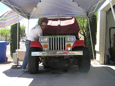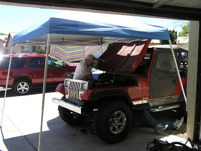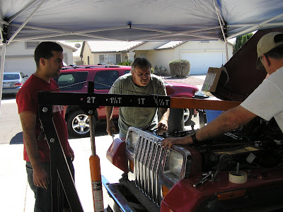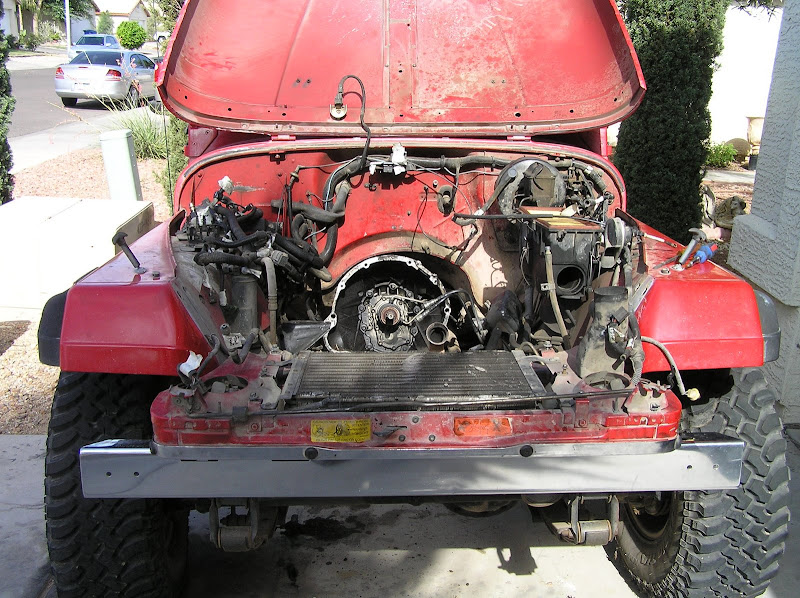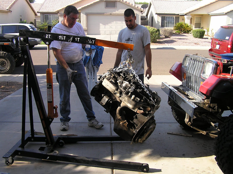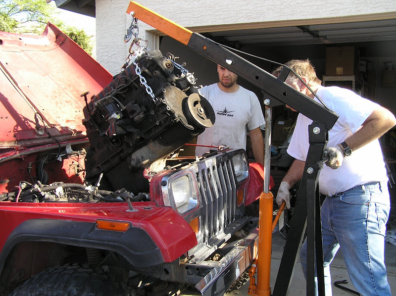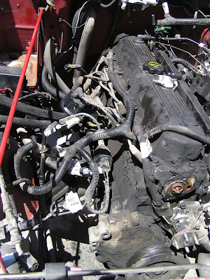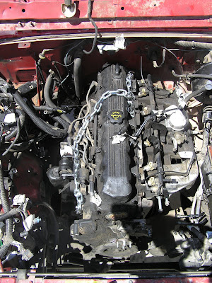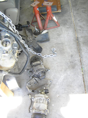 I had already pre-labels most of the hoses and electrical connections, so we just had to remove some of the major components from the engine. First came out the radiator, then the fan. Off with the Alt., A/C, and power steering pump.