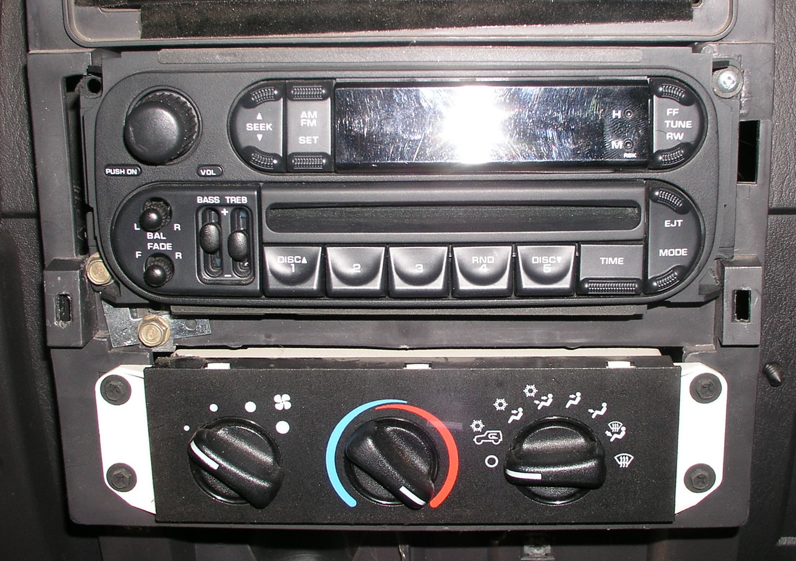 This is another non pertinent install. Remember that game when you were a kid where you kept trying over and over and over to get that darned round peg in the square hole? ....Me either. Anyway.... This is kind of like that. If you have a Jeep manufactured before 2003, you know that the stereo CD player, besides being temperamental at times, will not ever play your CDR's or RW's. The common logic would be to go out and buy a more high end head unit that would handle the different formats. The problem is, anything new and flashy is just theft bait when sitting in an open air (or plastic and canvas shrouded) Jeep. Not only will it attract them to your new brand name deck, but it gives them a reason to be in your vehicle and then presumably picking up other souvenirs for themselves along the way that may have remained happily halfway hidden had they not already been browsing. Now if you've the honors of having a '03 and up model TJ, you know that Jeep finally got with the program and made their stereo's multi-compatible to play your own tracks. So instead of beginning the seemingly eternal cycle of providing pawn shops everywhere with your local neighborhood criminal's baggings, I figured why not install a newer deck in Dana's '02 TJ and see how that worked out. We have never had any problem with the quality of the stock unit. In fact, we had recently installed a new deck in Chris's '01 Jeep, and another faceplate later, it still plays just as loud as his old stock one.