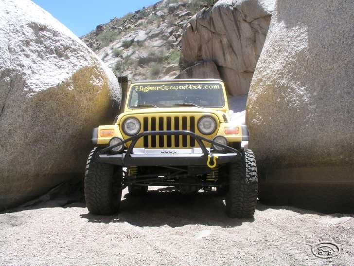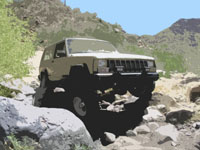 Anyway, again this trip, the drivers pretty much left no obstacle untouched. Once reaching Squeeze Rock, the end of our main trail ride, everyone had pretty much had their fill and there was no reason to run her again. Although, Jared, maybe because he felt he needed one more challenge, or maybe because the camera man felt he needed to use up all of his film, tried a tough little rock climb for higher ground. He pushed it and managed to maneuver up it for a nice king of the hill view. It was the straight out way off the mound that provided the real challenge though. It consisted of a multiple stair step, not too bad, as long as the steps matched up. But because they didn't, gravity fought his opposing wheels and almost won, forcing us to strategize a way to keep J and his Jeep from rolling door to top onto some jaggedly placed rocks below (one that was poised to come through his doorless side. To make matters worse, when J got out, after we had roped his Jeep off to the nearest rock, his seat belt locked up like a Banchee and we ended up having to disassemble it to get him strapped back in. To make a long story short, we got him to ease it down, while tied off and all three of us guys, easing his slack down. It was actually fun teamworking him off, but you could totally tell if we had slacked off the rope, we would have tested Darren's knotting skills for sure. |